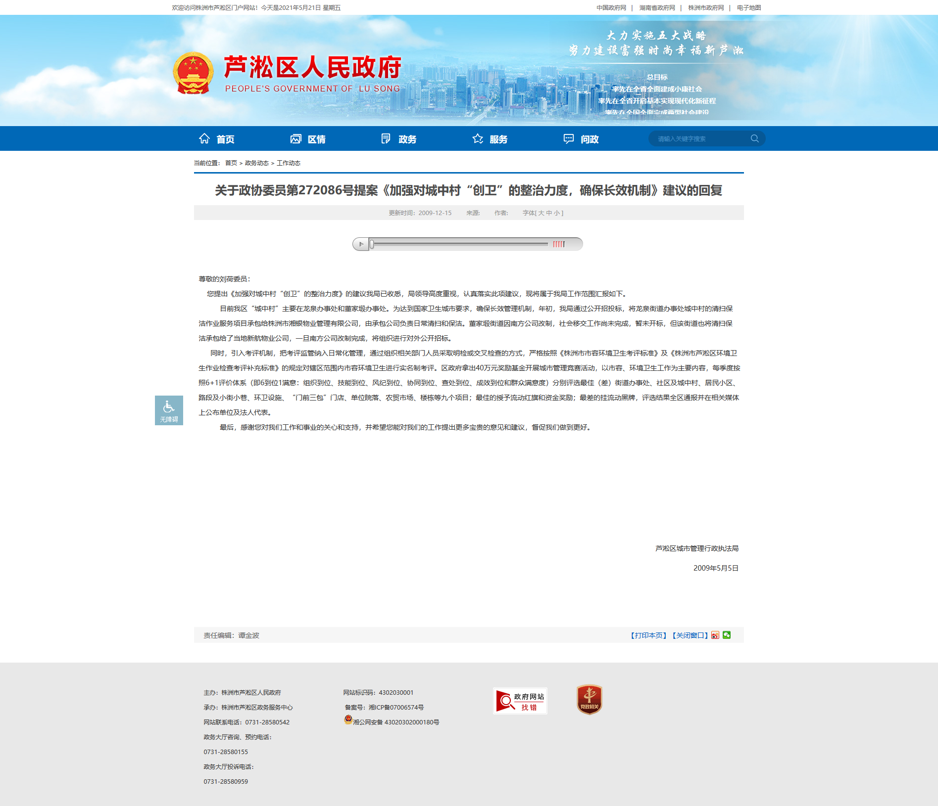 尊敬的刘荷委员: 您提出《加强对城中村“创卫”的整治力度》的建议我局已收悉,局领导高度重视,认真落实此项建议,现将属于我局工作范围汇报如下。目前我区“城中村”主要在龙泉办事处和董家塅办事处。为达到国家卫生城市要求,确保长效管理机制,年初,我局通过公开招投标,将龙泉街道办事处城中村的清扫保洁作业服务项目承包给株洲市湘银物业管理有限公司,由承包公司负责日常清扫和保洁。董家塅街道因南方公司改制,社会移交工作尚未完成,暂未开标,但该街道也将清扫保洁承包给了当地新航物业公司,一旦南方公司改制完成,将组织进行对外公开招标。 同时,引入考评机制,把考评监管纳入日常化管理,通过组织相关部门人员采取明检或交叉检查的方式,严格按照《株洲市市容环境卫生考评标准》及《株洲市芦淞区环境卫生作业检查考评补充标准》的规定对辖区范围内市容环境卫生进行实名制考评。区政府拿出40万元奖励基金开展城市管理竞赛活动,以市容、环境卫生工作为主要内容,每季度按照6 1评价体系(即6到位1满意:组织到位、技能到位、风纪到位、协同到位、查处到位、成效到位和群众满意度)分别评选最佳(差)街道办事处、社区及城中村、居民小区、路段及小街小巷、环卫设施、“门前三包”门店、单位院落、农贸市场、楼栋等九个项目;最佳的授予流动红旗和资金奖励;最差的挂流动黑牌,评选结果全区通报并在相关媒体上公布单位及法人代表。最后,感谢您对我们工作和事业的关心和支持,并希望您能对我们的工作提出更多宝贵的意见和建议,督促我们做到更好。 芦淞区城市管理行政执法局2009年5月5日