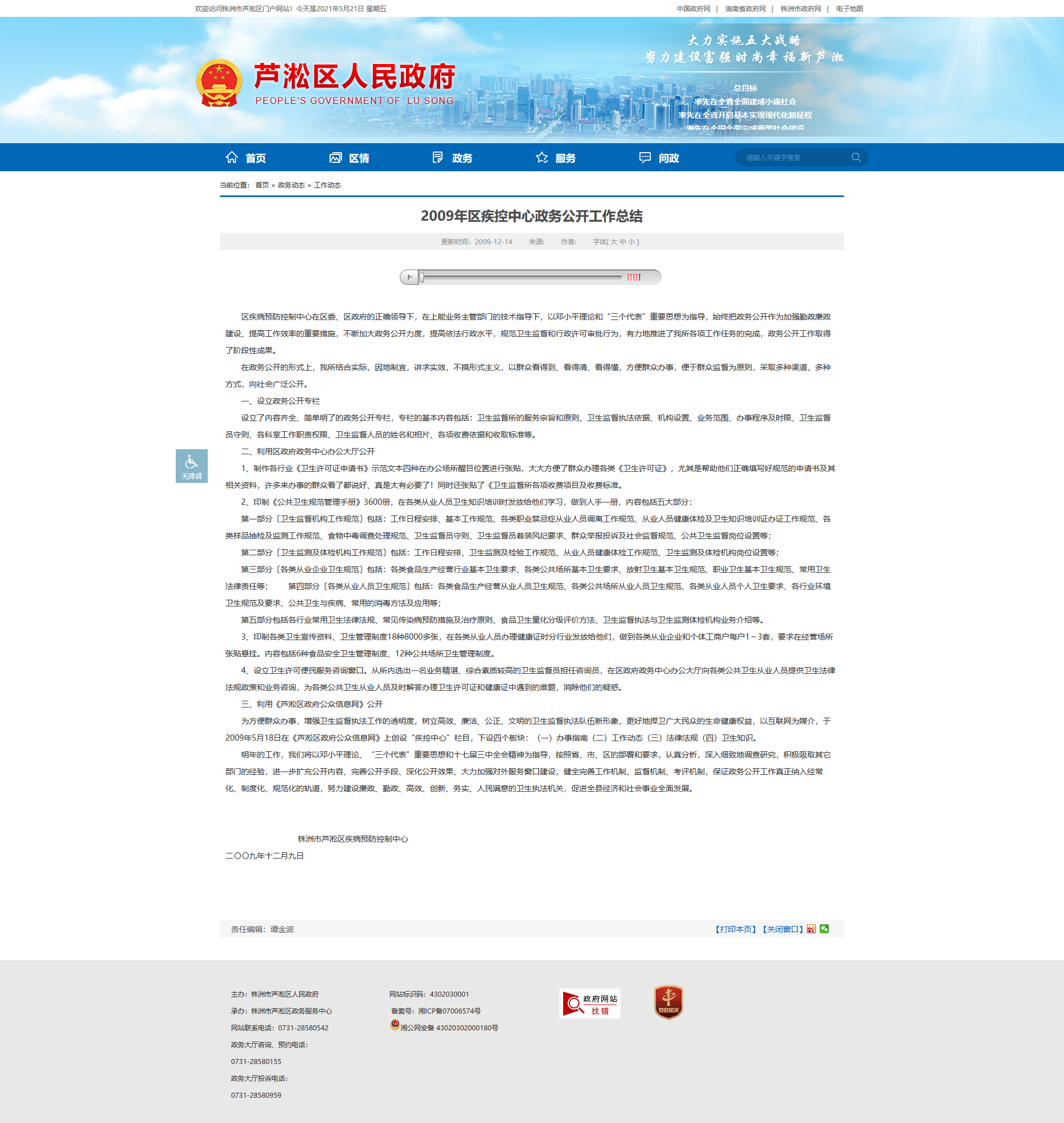 三、利用《芦淞区政府公众信息网》公开 为方便群众办事,增强卫生监督执法工作的透明度,树立高效、廉洁、公正、文明的卫生监督执法队伍新形象,更好地捍卫广大民众的生命健康权益,以互联网为媒介,于2009年5月18日在《芦淞区政府公众信息网》上创设“疾控中心”栏目,下设四个板块:(一)办事指南(二)工作动态(三)法律法规(四)卫生知识。 明年的工作,我们将以邓小平理论、“三个代表”重要思想和十七届三中全会精神为指导,按照省、市、区的部署和要求,认真分析,深入细致地调查研究,积极吸取其它部门的经验,进一步扩充公开内容、完善公开手段、深化公开效果、大力加强对外服务窗口建设,健全完善工作机制、监督机制、考评机制,保证政务公开工作真正纳入经常化、制度化、规范化的轨道,努力建设廉政、勤政、高效、创新、务实、人民满意的卫生执法机关,促进全县经济和社会事业全面发展。 株洲市芦淞区疾病预防控制中心二〇〇九年十二月九日