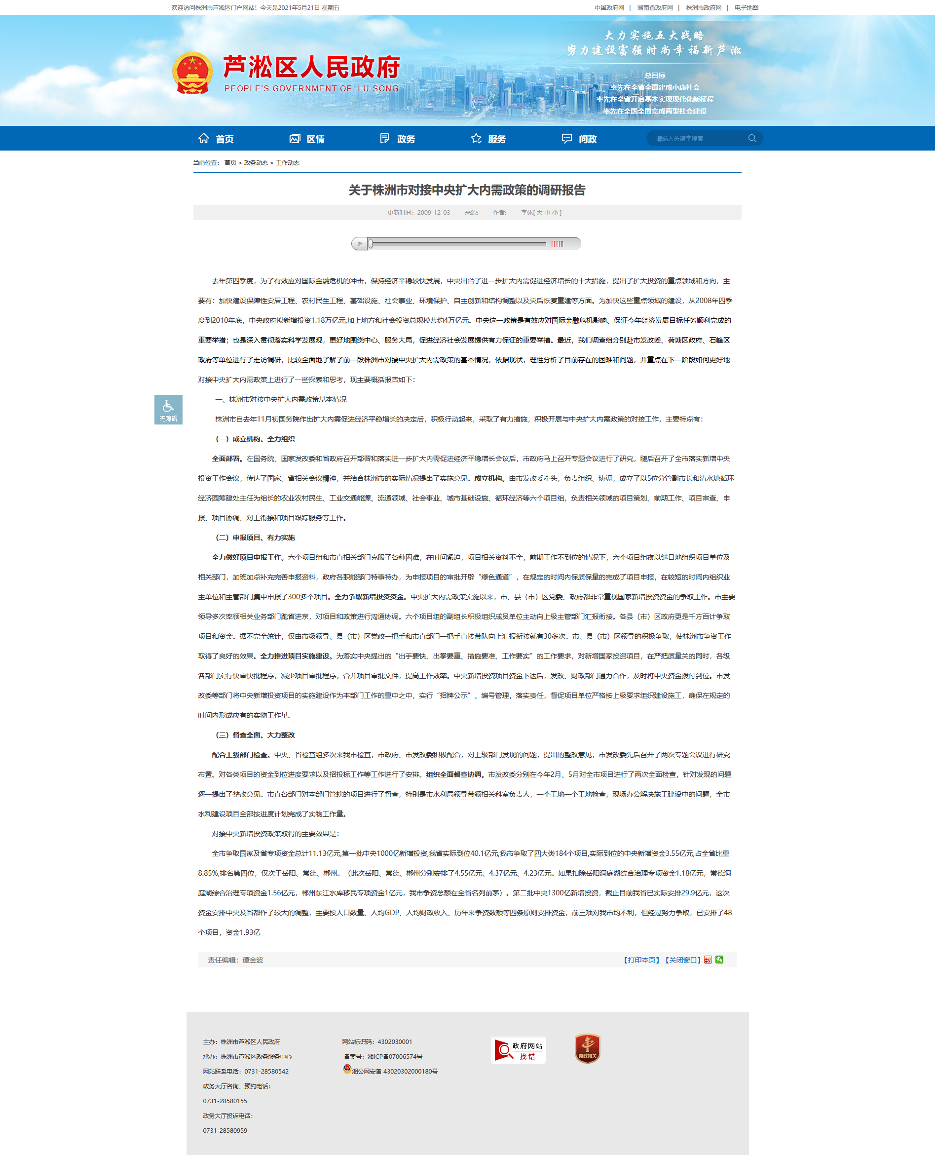 去年第四季度,为了有效应对国际金融危机的冲击,保持经济平稳较快发展,中央出台了进一步扩大内需促进经济增长的十大措施,提出了扩大投资的重点领域和方向,主要有:加快建设保障性安居工程、农村民生工程、基础设施、社会事业、环境保护、自主创新和结构调整以及灾后恢复重建等方面。为加快这些重点领域的建设,从2008年四季度到2010年底,中央政府拟新增投资1.18万亿元,加上地方和社会投资总规模共约4万亿元。中央这一政策是有效应对国际金融危机影响、保证今年经济发展目标任务顺利完成的重要举措;也是深入贯彻落实科学发展观,更好地围绕中心、服务大局,促进经济社会发展提供有力保证的重要举措。最近,我们调查组分别赴市发改委、荷塘区政府、石峰区政府等单位进行了走访调研,比较全面地了解了前一段株洲市对接中央扩大内需政策的基本情况,依据现状,理性分析了目前存在的困难和问题,并重点在下一阶段如何更好地对接中央扩大内需政策上进行了一些探索和思考,现主要概括报告如下:一、株洲市对接中央扩大内需政策基本情况株洲市自去年11月初国务院作出扩大内需促进经济平稳增长的决定后,积极行动起来,采取了有力措施,积极开展与中央扩大内需政策的对接工作,主要特点有: