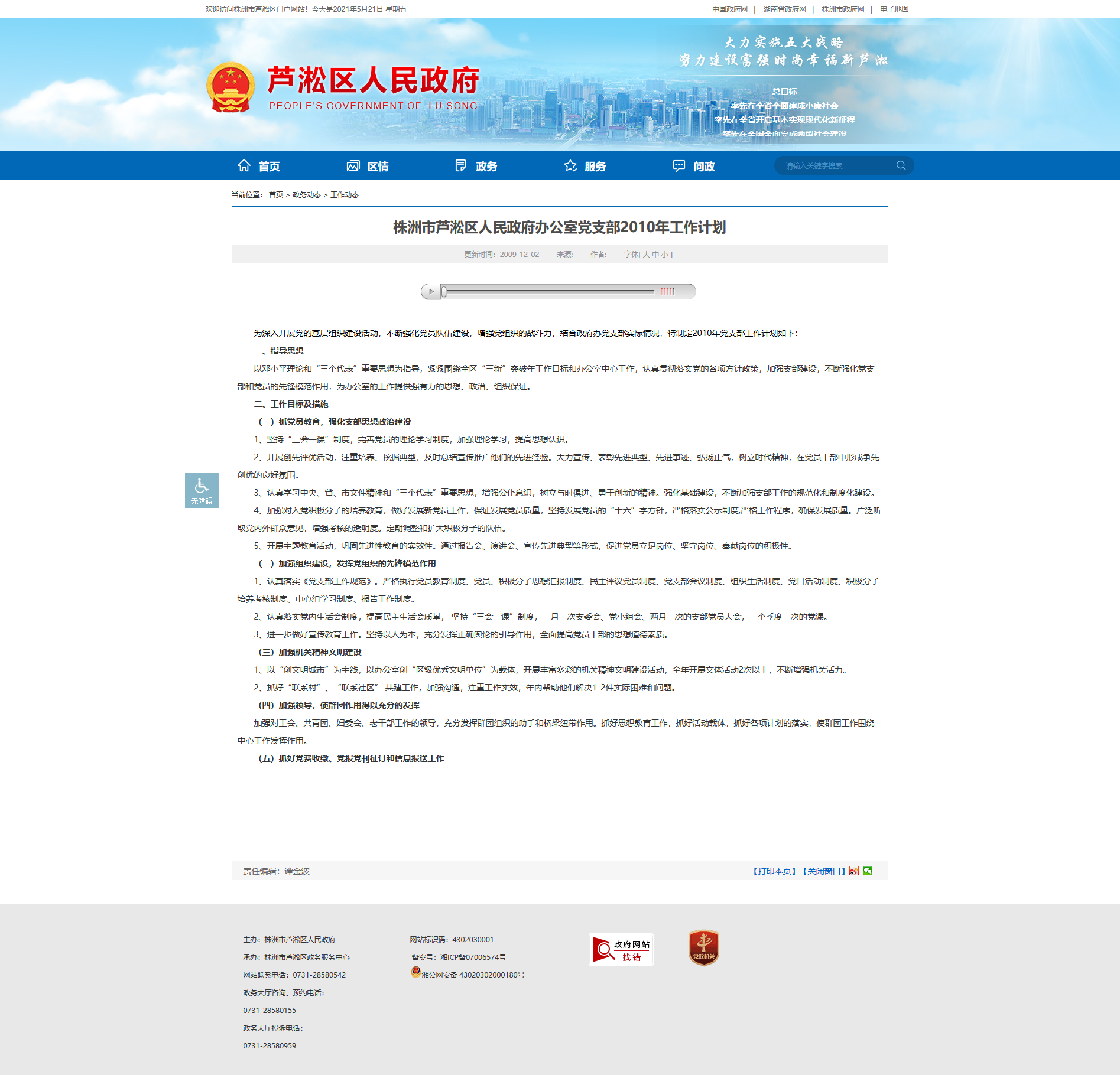 株洲市芦淞区人民政府办公室党支部2010年工作计划