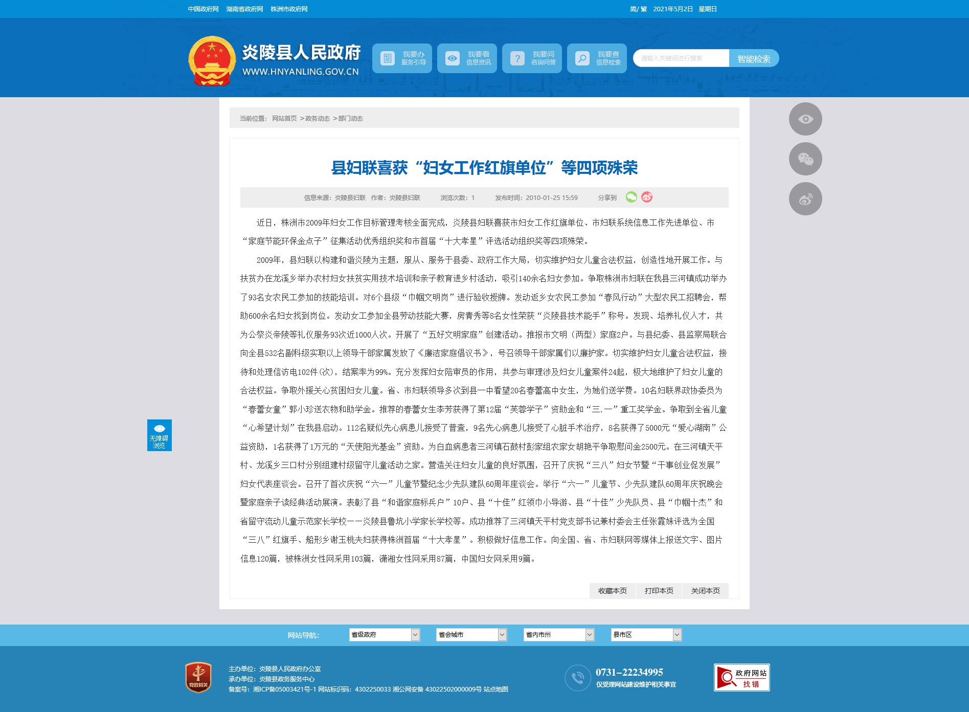 近日,株洲市2009年妇女工作目标管理考核全面完成,炎陵县妇联喜获市妇女工作红旗单位、市妇联系统信息工作先进单位、市“家庭节能环保金点子”征集活动优秀组织奖和市首届“十大孝星”评选活动组织奖等四项殊荣。