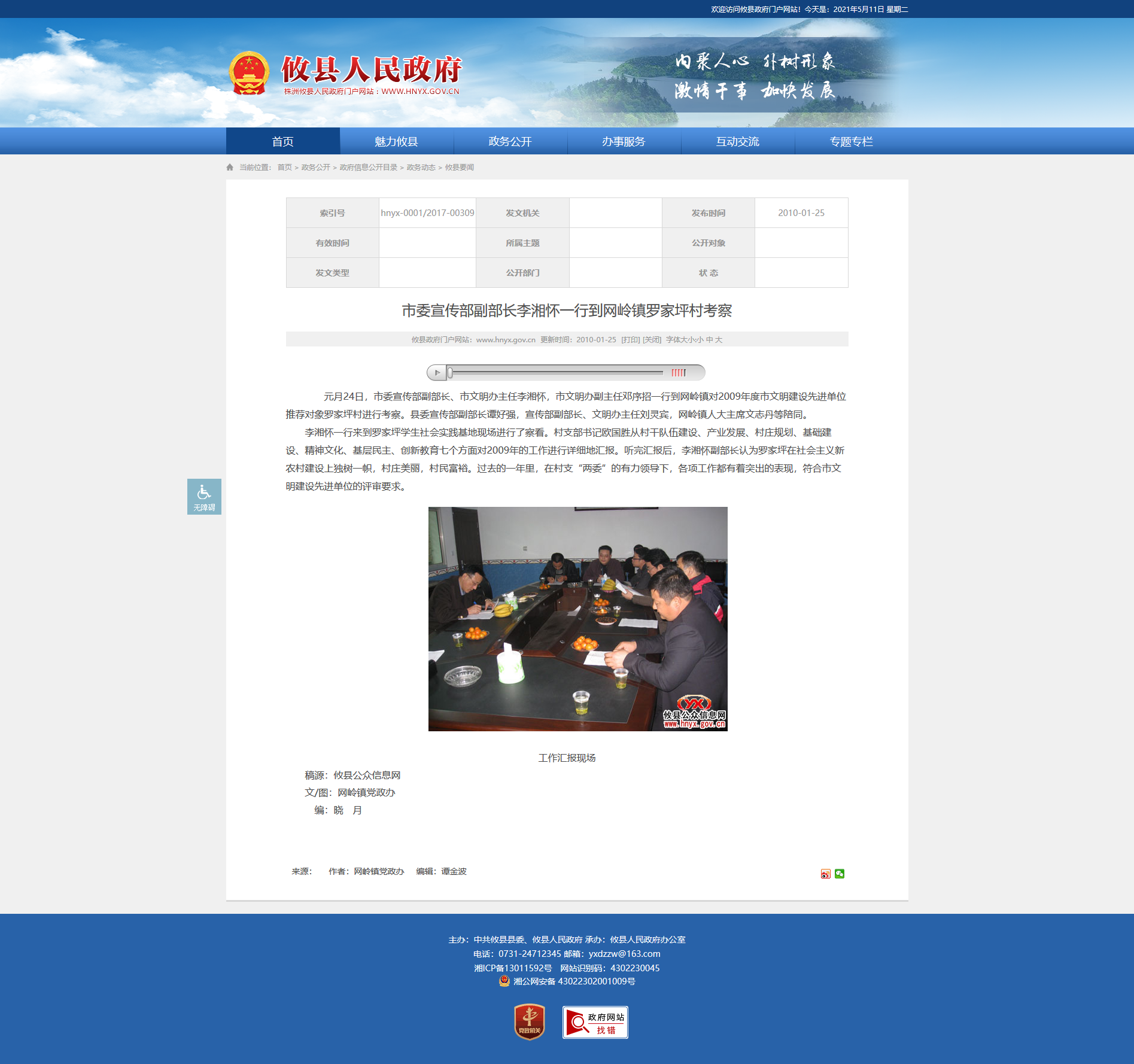 元月24日,市委宣传部副部长、市文明办主任李湘怀,市文明办副主任邓序招一行到网岭镇对2009年度市文明建设先进单位推荐对象罗家坪村进行考察。县委宣传部副部长谭好强,宣传部副部长、文明办主任刘灵宾,网岭镇人大主席文志丹等陪同。