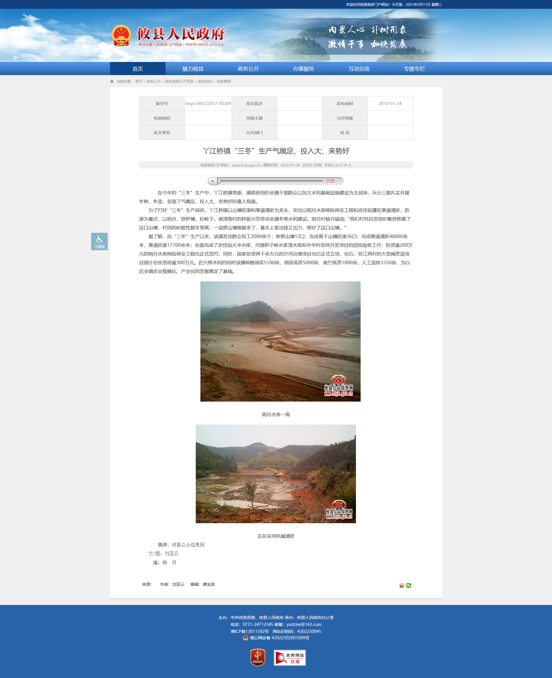 为了打好“三冬”生产战役,丫江桥镇以山塘防渗和渠道清淤为龙头,突出以明月水库除险保安工程和皮佳如灌区渠道清淤、防渗为重点,以明月、铁炉塘、杉岭下、庙湾等村的样板示范带动全镇冬修水利建设。明月村杨开端说:“我们村民自发组织集资修建了这口山塘,村民的积极性都非常高,一说修山塘就都来了,基本上是出钱又出力,修好了这口山塘。”
