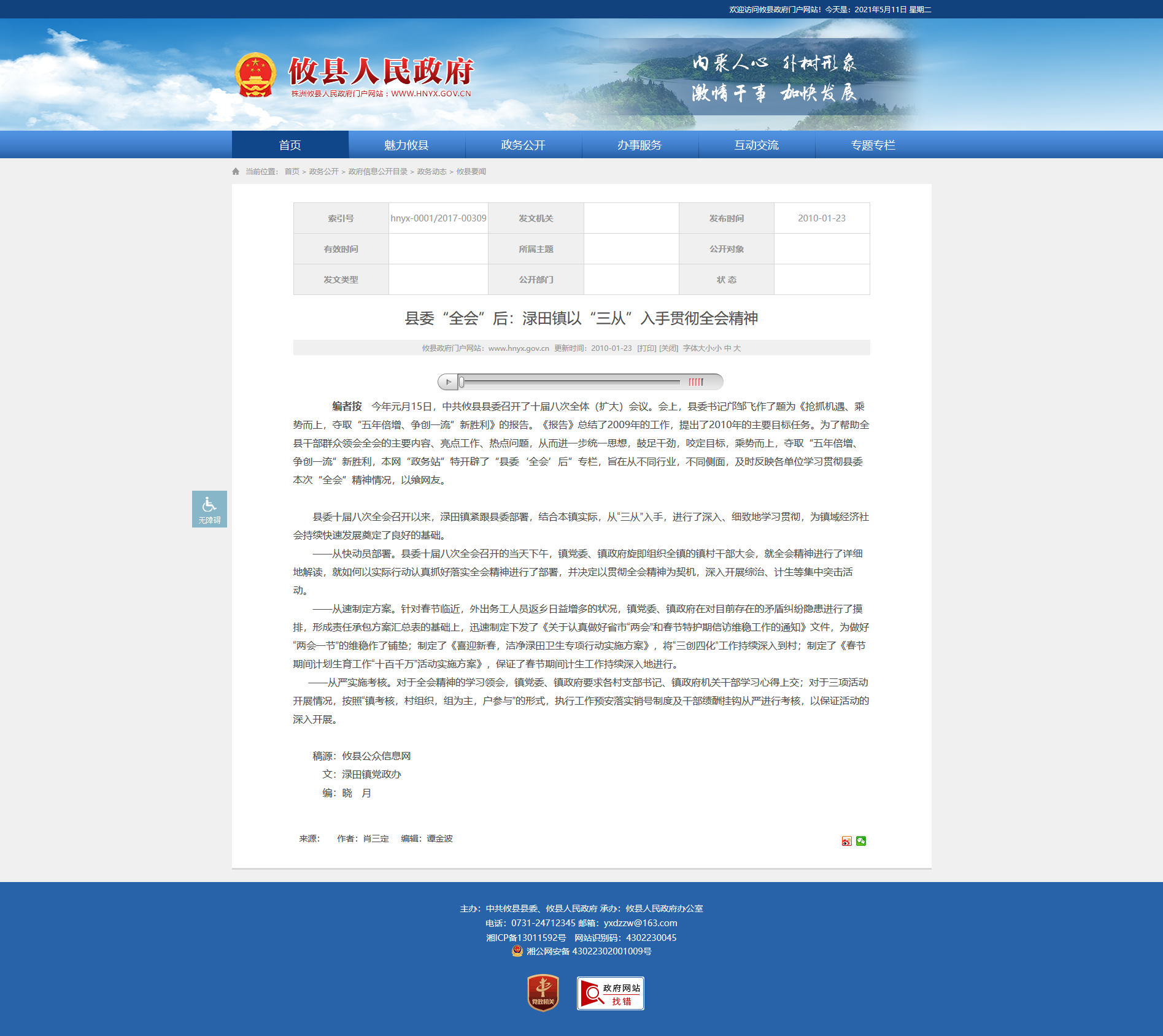 编者按 今年元月15日,中共攸县县委召开了十届八次全体(扩大)会议。会上,县委书记邝邹飞作了题为《抢抓机遇、乘势而上,夺取“五年倍增、争创一流”新胜利》的报告。《报告》总结了2009年的工作,提出了2010年的主要目标任务。为了帮助全县干部群众领会全会的主要内容、亮点工作、热点问题,从而进一步统一思想,鼓足干劲,咬定目标,乘势而上,夺取“五年倍增、争创一流”新胜利,本网“政务站”特开辟了“县委‘全会’后”专栏,旨在从不同行业,不同侧面,及时反映各单位学习贯彻县委本次“全会”精神情况,以飨网友。