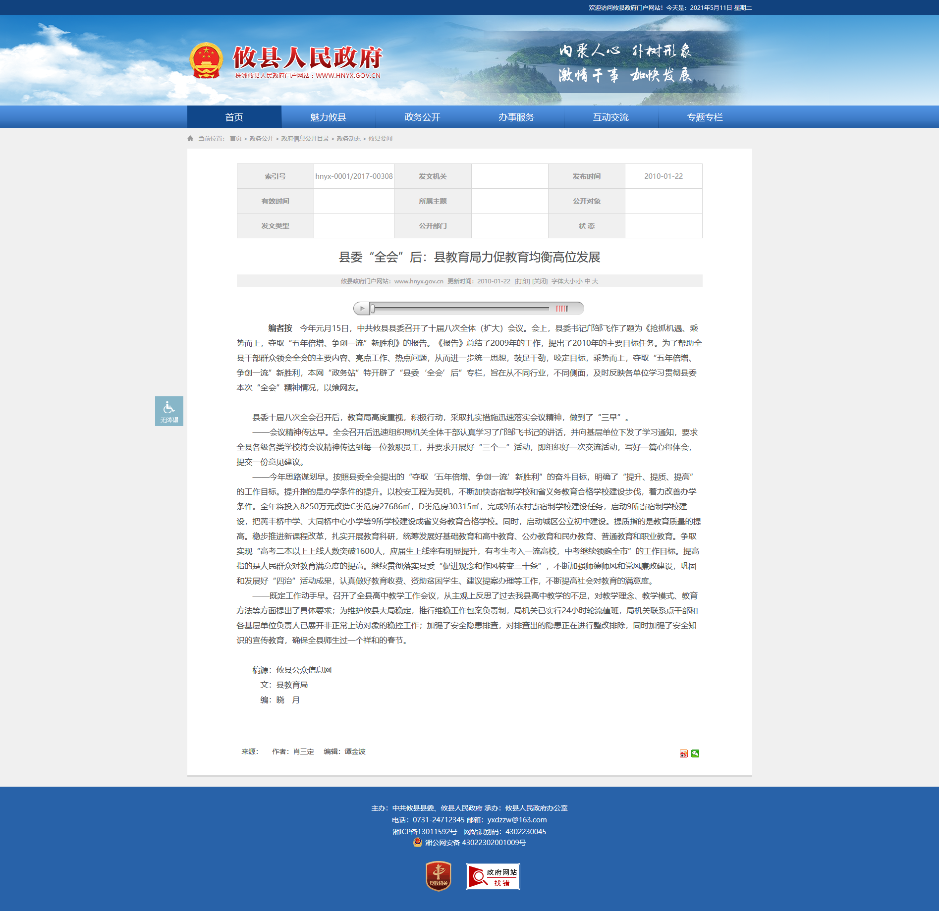 ——今年思路谋划早。按照县委全会提出的“夺取‘五年倍增、争创一流’新胜利”的奋斗目标,明确了“提升、提质、提高”的工作目标。提升指的是办学条件的提升。以校安工程为契机,不断加快寄宿制学校和省义务教育合格学校建设步伐,着力改善办学条件。全年将投入8250万元改造C类危房27686㎡,D类危房30315㎡,完成9所农村寄宿制学校建设任务,启动9所寄宿制学校建设,把黄丰桥中学、大同桥中心小学等9所学校建设成省义务教育合格学校。同时,启动城区公立初中建设。提质指的是教育质量的提高。稳步推进新课程改革,扎实开展教育科研,统筹发展好基础教育和高中教育、公办教育和民办教育、普通教育和职业教育。争取实现“高考二本以上上线人数突破1600人,应届生上线率有明显提升,有考生考入一流高校,中考继续领跑全市”的工作目标。提高指的是人民群众对教育满意度的提高。继续贯彻落实县委“促进观念和作风转变三十条”,不断加强师德师风和党风廉政建设,巩固和发展好“四治”活动成果,认真做好教育收费、资助贫困学生、建议提案办理等工作,不断提高社会对教育的满意度。