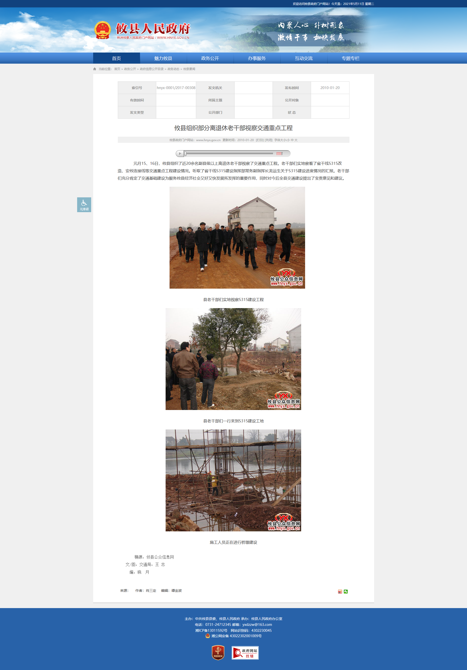 元月15、16日,攸县组织了近20余名副县级以上离退休老干部视察了交通重点工程。老干部们实地察看了省干线S315改造、安攸连接线等交通重点工程建设情况。听取了省干线S315建设指挥部常务副指挥长龙运生关于S315建设进度情况的汇报。老干部们充分肯定了交通基础建设为服务攸县经济社会又好又快发展所发挥的重要作用,同时对今后全县交通建设提出了宝贵意见和建议。