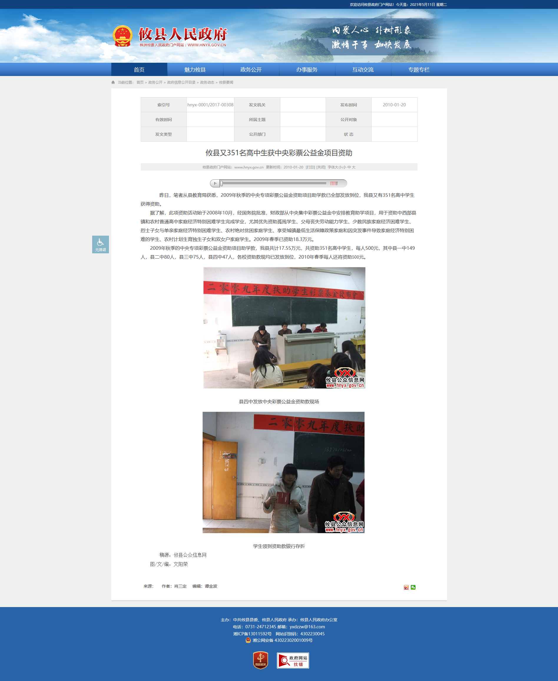 2009年秋季的中央专项彩票公益金资助项目助学款,我县共计17.55万元,共资助351名高中学生,每人500元,其中县一中149人,县二中80人,县三中75人,县四中47人,各校资助款现均已发放到位,2010年春季每人还将资助500元。