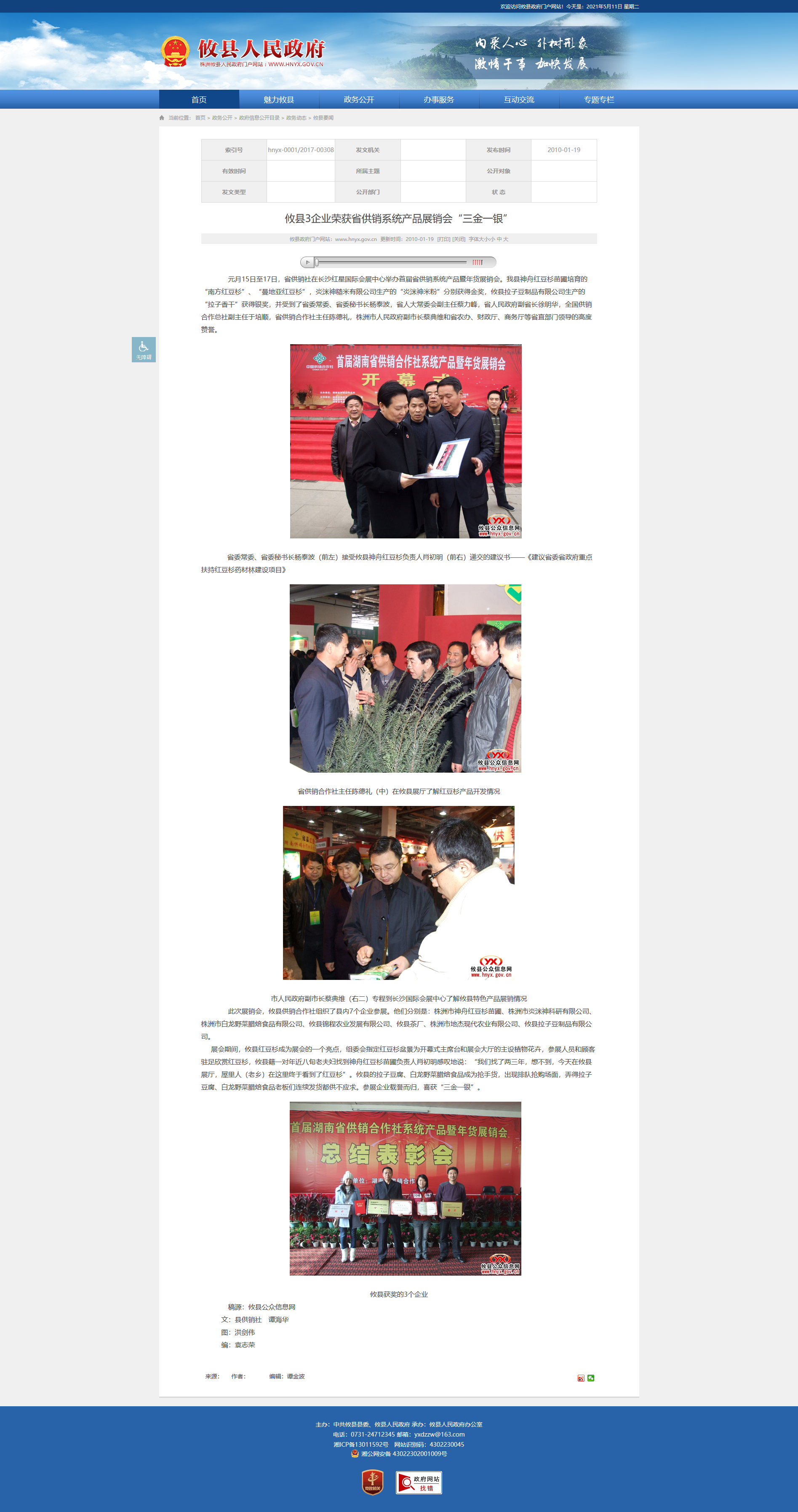 元月15日至17日,省供销社在长沙红星国际会展中心举办首届省供销系统产品暨年货展销会。我县神舟红豆杉苗圃培育的“南方红豆杉”、“曼地亚红豆杉”,炎洣神糙米有限公司生产的“炎洣神米粉”分别获得金奖,攸县拉子豆制品有限公司生产的“拉子香干”获得银奖,并受到了省委常委、省委秘书长杨泰波,省人大常委会副主任蔡力峰,省人民政府副省长徐明华,全国供销合作总社副主任于培顺,省供销合作社主任陈德礼,株洲市人民政府副市长蔡典维和省农办、财政厅、商务厅等省直部门领导的高度赞誉。