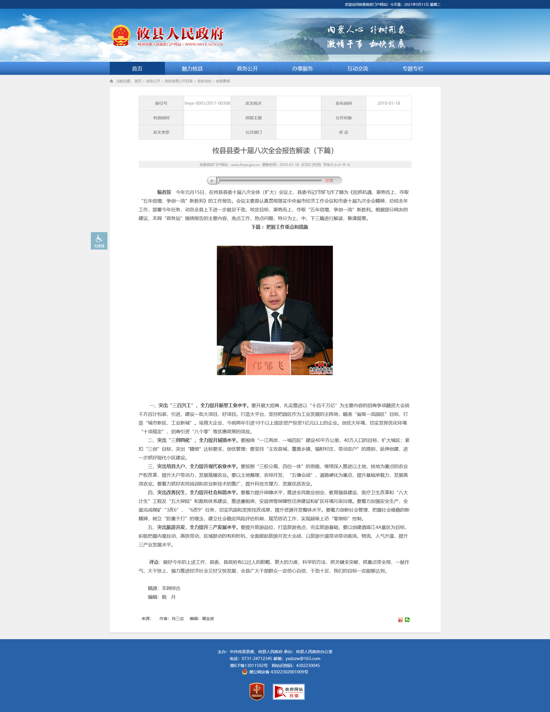 编者按 今年元月15日,在攸县县委十届八次全体(扩大)会议上,县委书记邝邹飞作了题为《抢抓机遇、乘势而上,夺取“五年倍增、争创一流”新胜利》的工作报告。会议主要是认真贯彻落实中央省市经济工作会议和市委十届九次全会精神,总结去年工作,部署今年任务,动员全县上下进一步鼓足干劲,咬定目标,乘势而上,夺取“五年倍增、争创一流”新胜利。根据部分网友的建议,本网“政务站”围绕报告的主要内容、亮点工作、热点问题,特分为上、中、下三篇进行解读,敬请留意。
