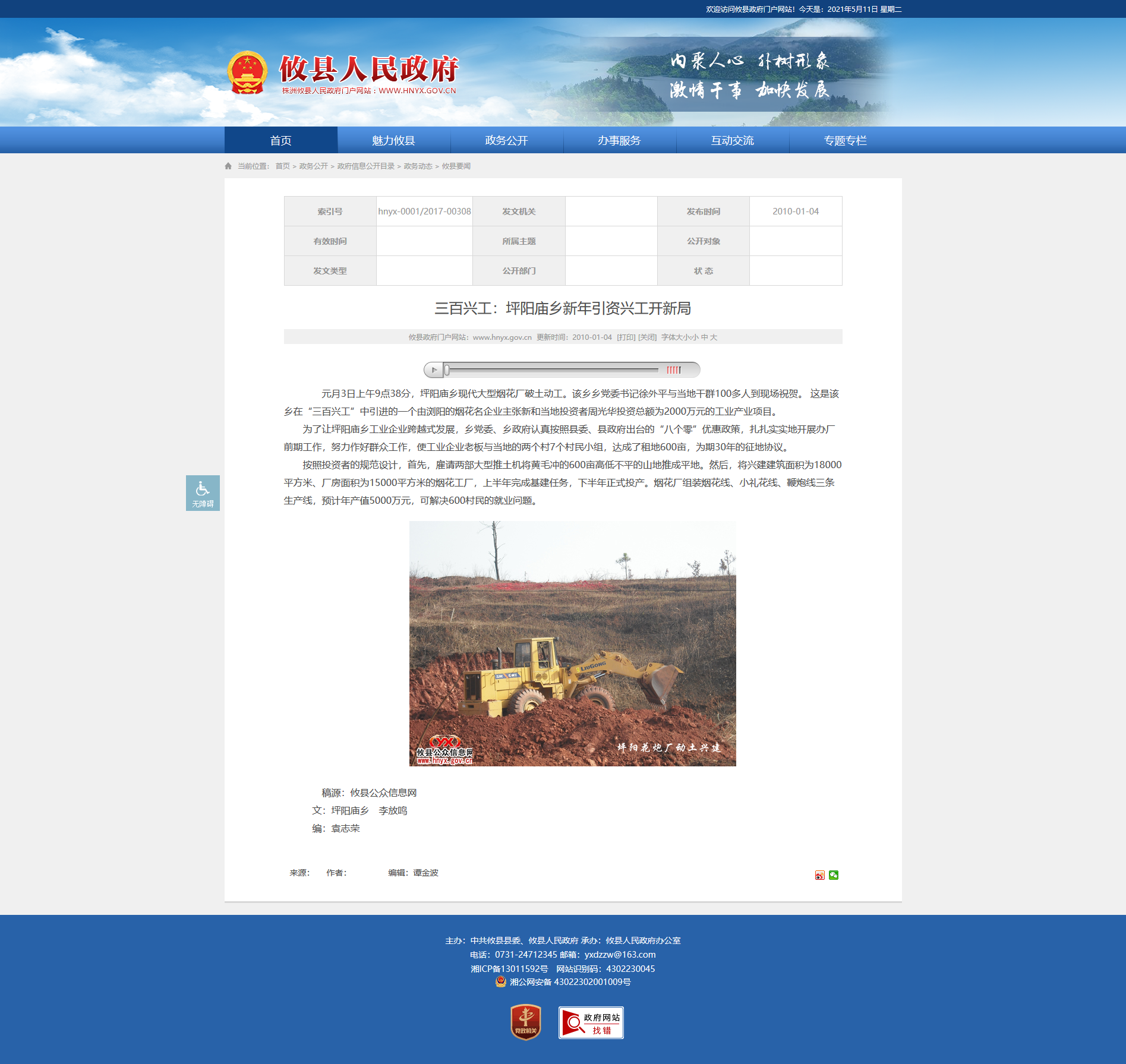 元月3日上午9点38分,坪阳庙乡现代大型烟花厂破土动工。该乡乡党委书记徐外平与当地干群100多人到现场祝贺。 这是该乡在“三百兴工”中引进的一个由浏阳的烟花名企业主张新和当地投资者周光华投资总额为2000万元的工业产业项目。