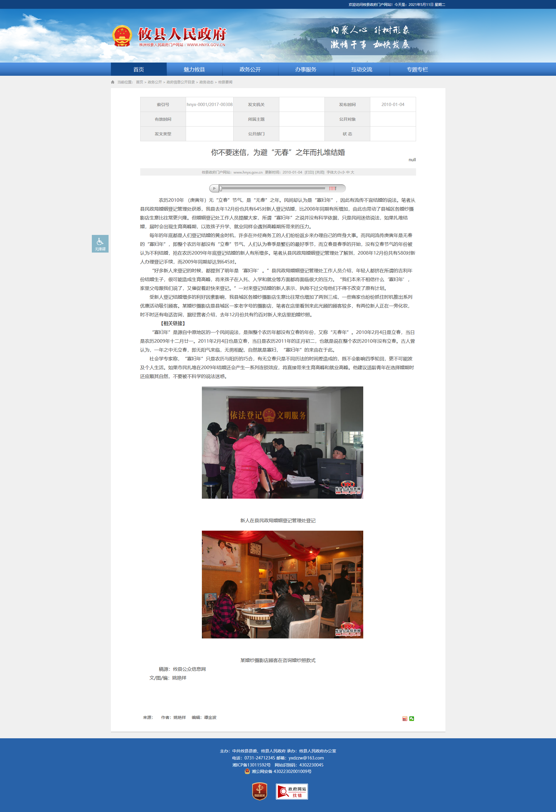 每年的年底都是人们登记结婚的黄金时机,许多在外经商务工的人们纷纷返乡来办理自己的终身大事。而民间流传庚寅年是无春的“寡妇年”,即整个农历年都没有“立春”节气,人们认为春季是繁衍的最好季节,而立春是春季的开始,没有立春节气的年份被认为不利结婚,抢在农历2009年年底登记结婚的新人有所增多。笔者从县民政局婚姻登记管理处了解到,2008年12月份共有580对新人办理登记手续,而2009年同期却达到645对。