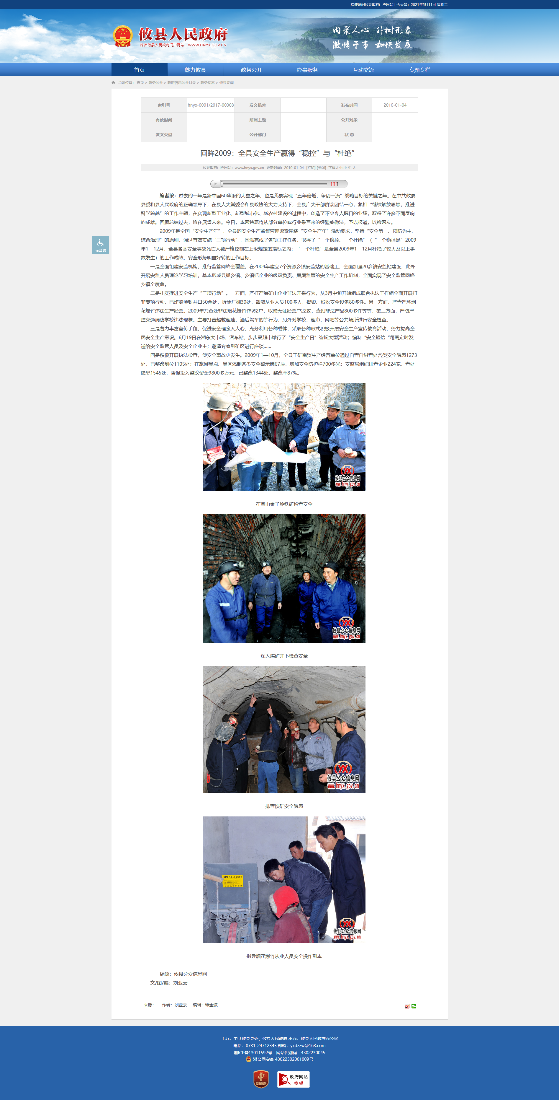 2009年是全国“安全生产年”,全县的安全生产监督管理紧紧围绕“安全生产年”活动要求,坚持“安全第一、预防为主、综合治理”的原则,通过有效实施“三项行动”,圆满完成了各项工作任务,取得了“一个稳控、一个杜绝”(“一个稳控是”2009年1—12月,全县各类安全事故死亡人数严格控制在上级规定的指标之内;“一个杜绝”是全县2009年1—12月杜绝了较大及以上事故发生)的工作成效,安全形势明显好转的工作目标。