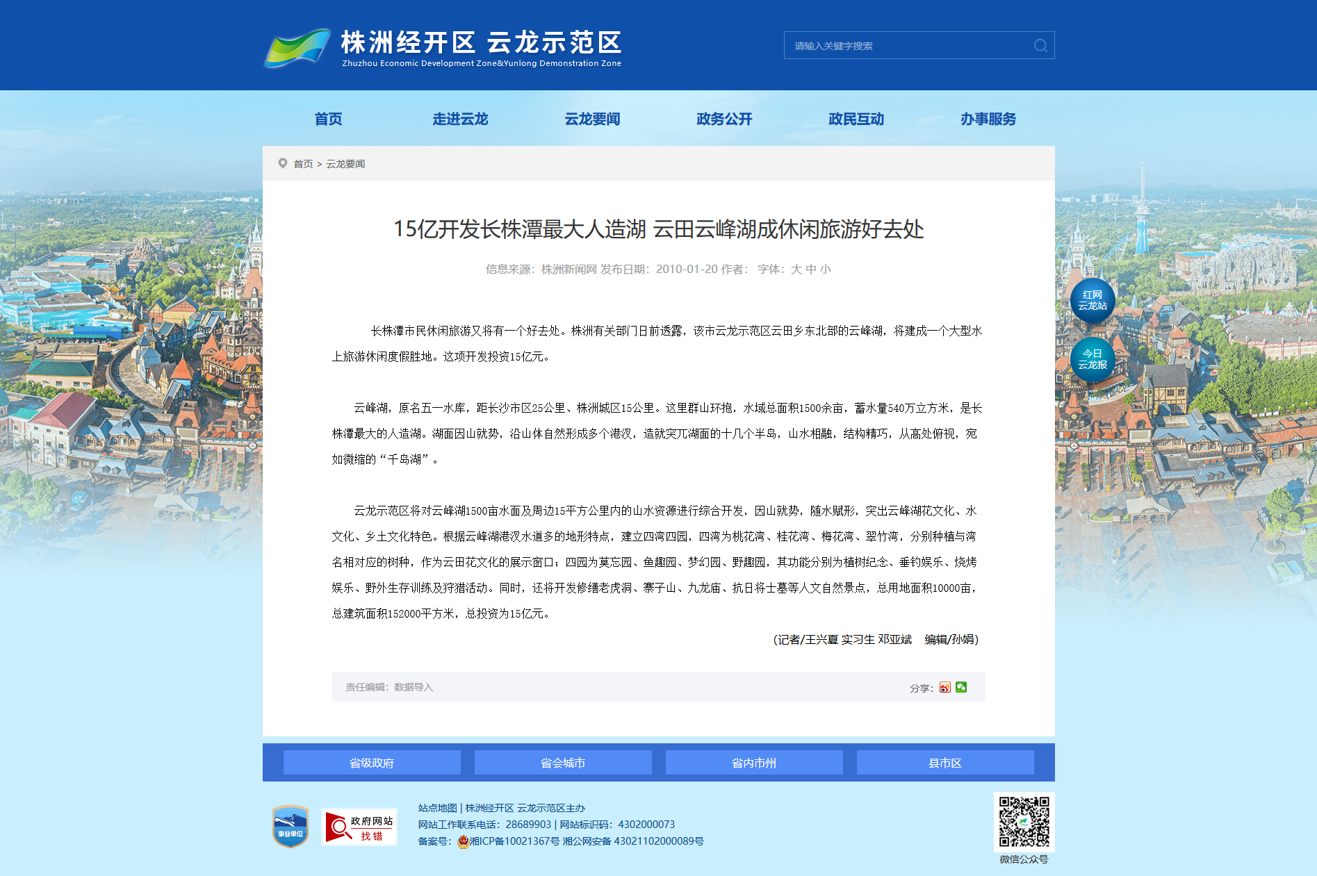长株潭市民休闲旅游又将有一个好去处。株洲有关部门日前透露,该市云龙示范区云田乡东北部的云峰湖,将建成一个大型水上旅游休闲度假胜地。这项开发投资15亿元。