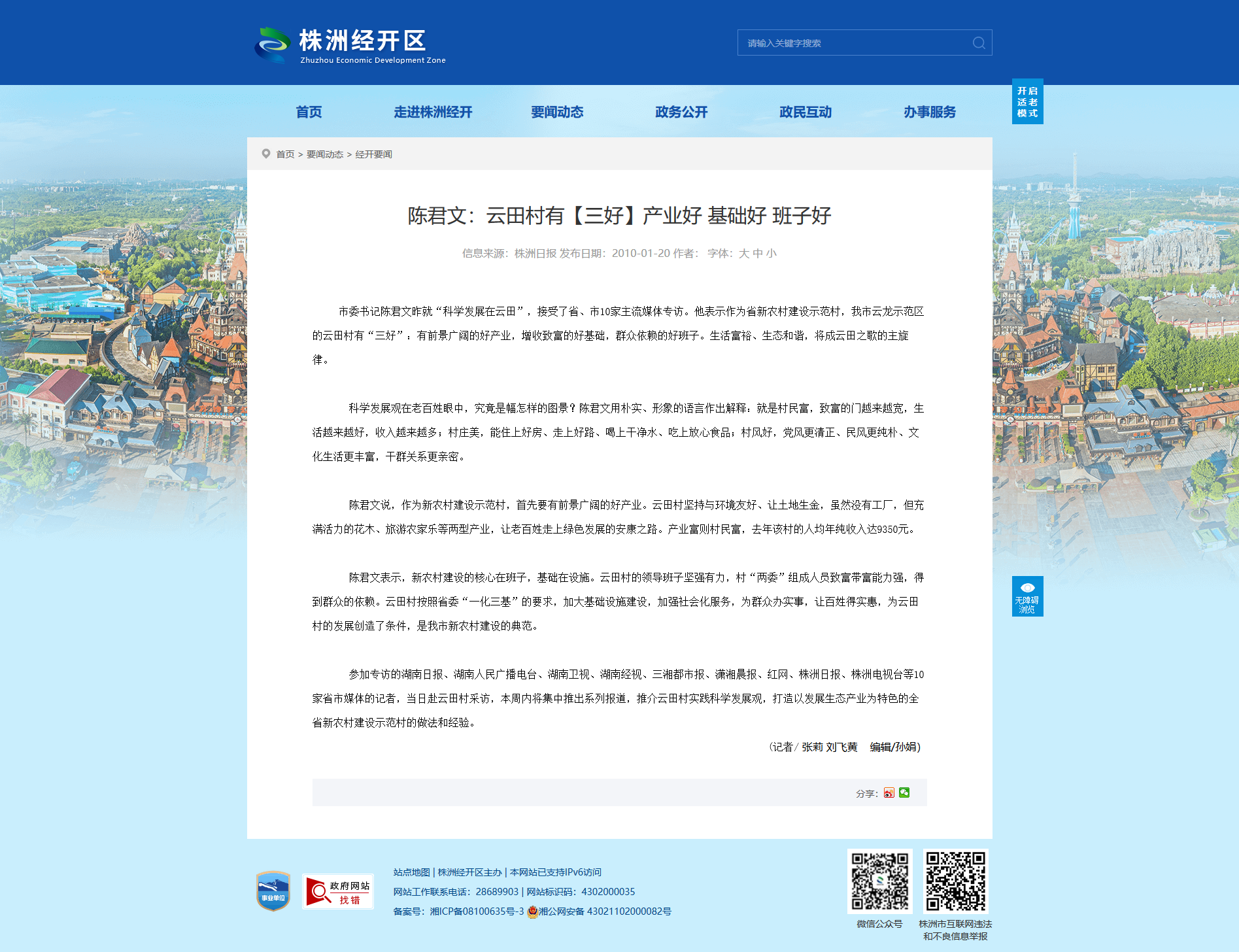 市委书记陈君文昨就“科学发展在云田”,接受了省、市10家主流媒体专访。他表示作为省新农村建设示范村,我市云龙示范区的云田村有“三好”:有前景广阔的好产业,增收致富的好基础,群众依赖的好班子。生活富裕、生态和谐,将成云田之歌的主旋律。