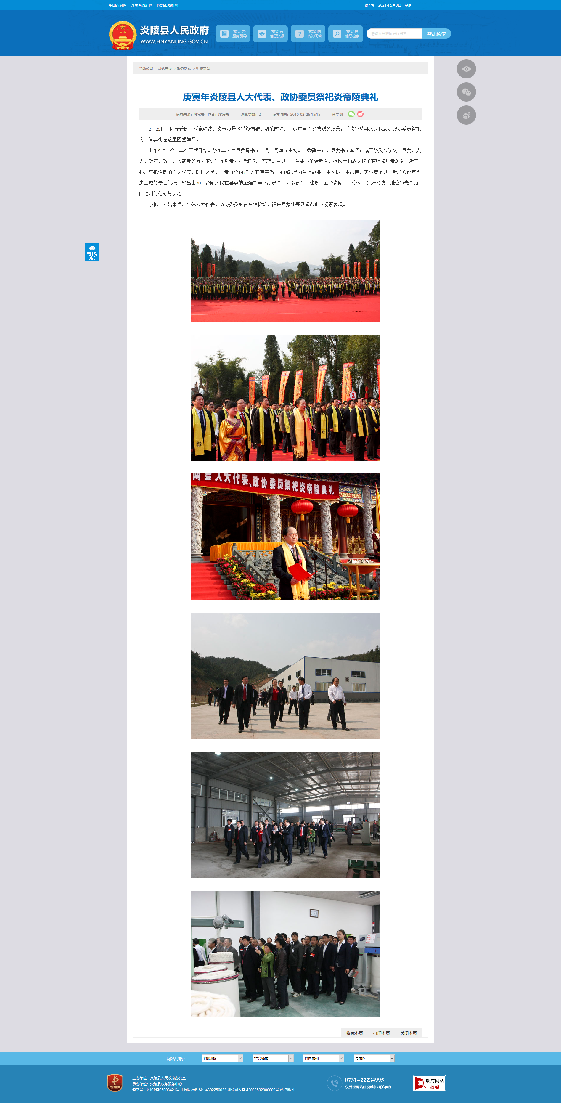 上午9时,祭祀典礼正式开始。祭祀典礼由县委副书记、县长周建光主持。市委副书记、县委书记李晖恭读了祭炎帝陵文。县委、人大、政府、政协、人武部等五大家分别向炎帝神农氏敬献了花篮。由县中学生组成的合唱队,列队于神农大殿前高唱《炎帝颂》。所有参加祭祀活动的人大代表、政协委员、干部群众约2千人齐声高唱《团结就是力量》歌曲。用虔诚、用歌声,表达着全县干部群众虎年虎虎生威的豪迈气概,彰显出20万炎陵人民在县委的坚强领导下打好“四大战役”,建设“五个炎陵”,夺取“又好又快、进位争先”新的胜利的信心与决心。