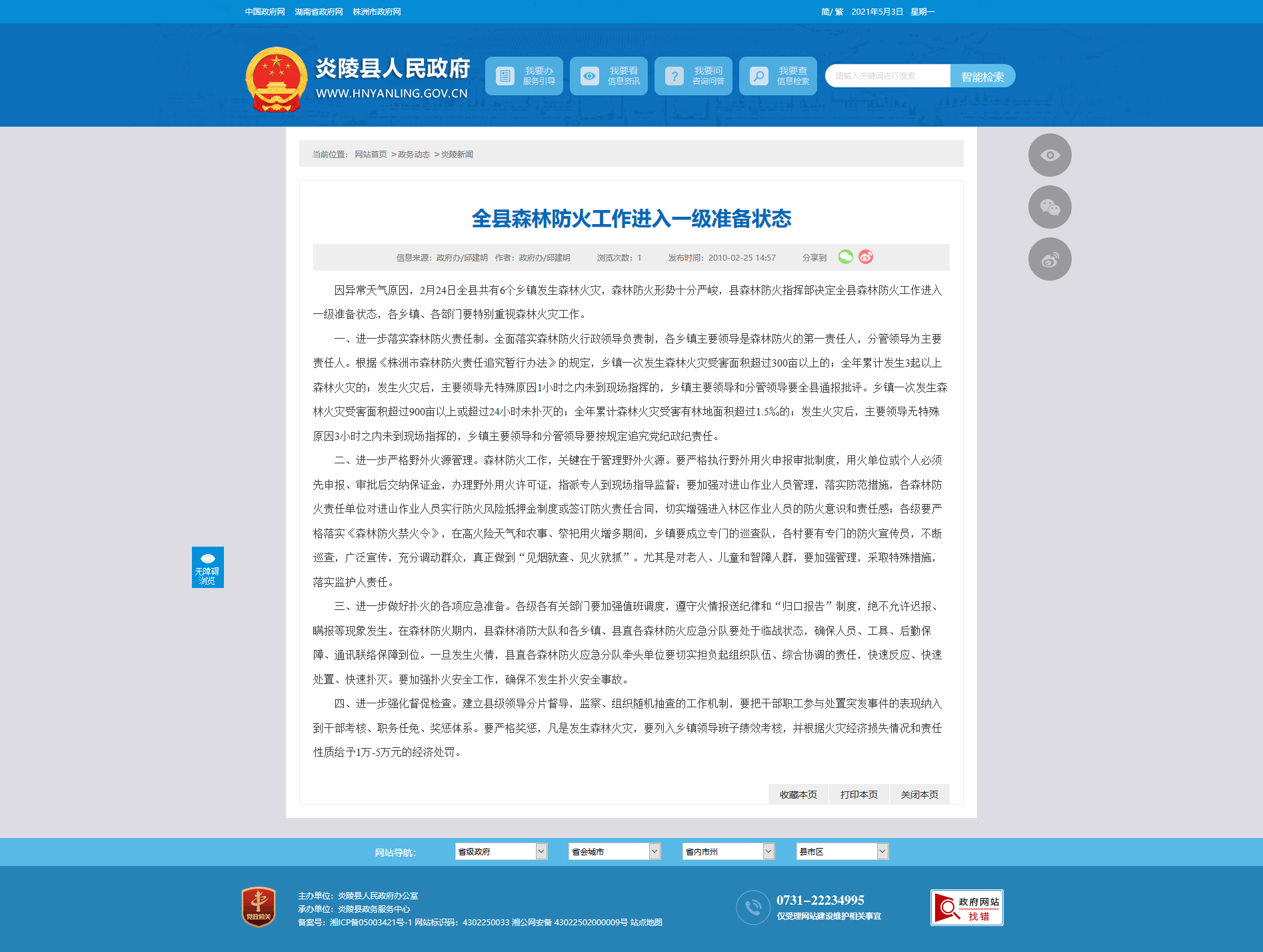 因异常天气原因,2月24日全县共有6个乡镇发生森林火灾,森林防火形势十分严峻,县森林防火指挥部决定全县森林防火工作进入一级准备状态,各乡镇、各部门要特别重视森林火灾工作。