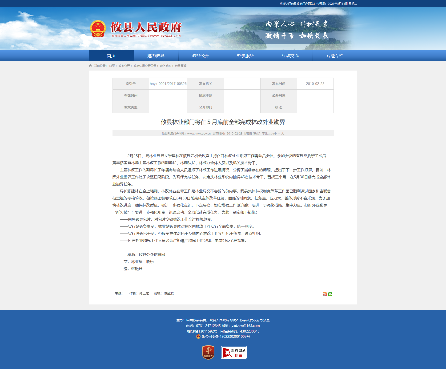 局长张建林在会上强调,林改外业勘界工作是林业局义不容辞的份内事,我县集体林权制度改革工作虽已顺利通过国家和省联合检查组的考核验收,但按照上级要求在6月30日前完成主体改革任务,面临的时间紧、任务重、压力大,整体形势不容乐观。为了加快林改进度,确保林改质量,要进一步强化意识,下定决心,切实增强工作紧迫感;要进一步强化措施,集中力量,打好外业勘界“歼灭仗”;要进一步强化职责,迅速启动,全力以赴完成任务。为此,制定如下措施: