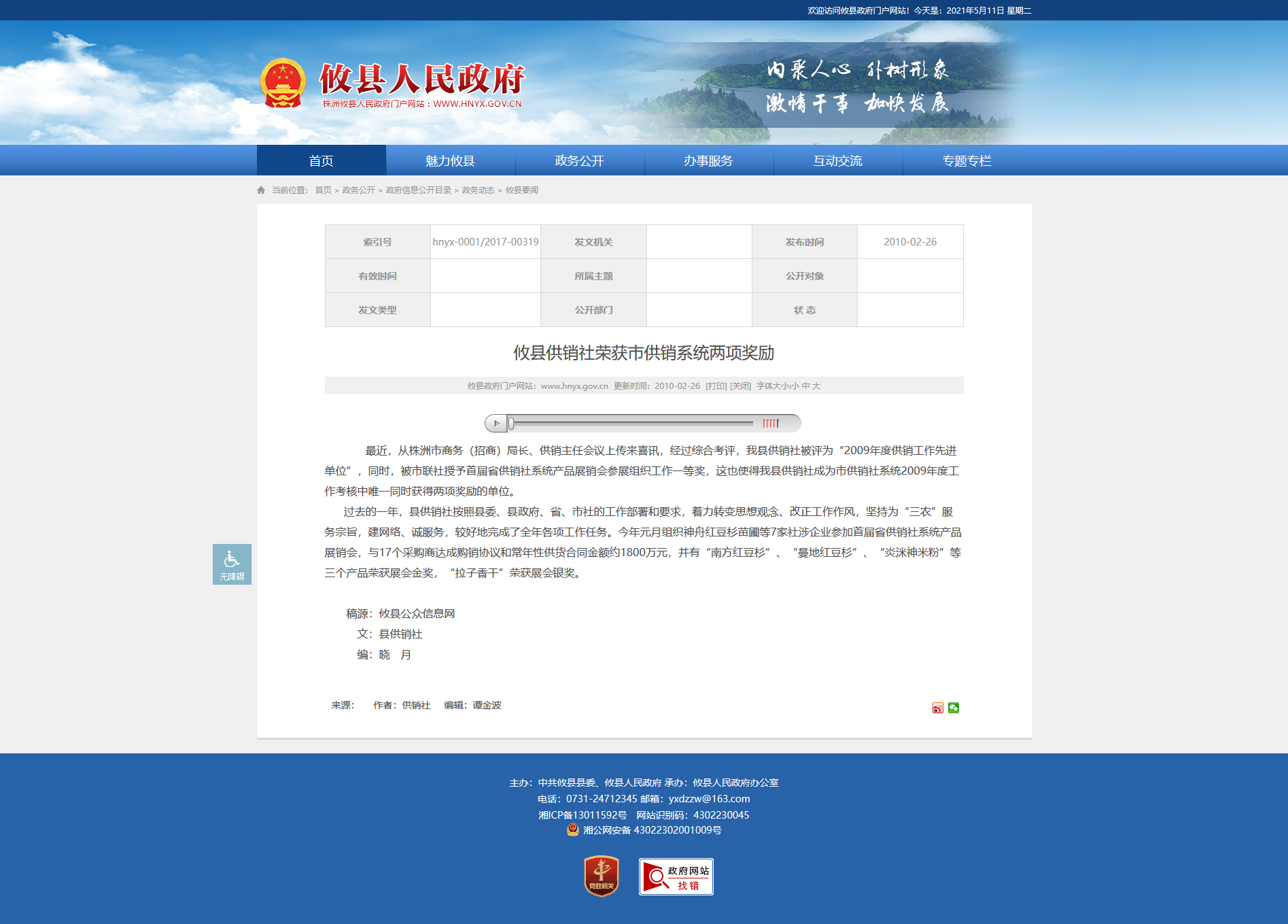 最近,从株洲市商务(招商)局长、供销主任会议上传来喜讯,经过综合考评,我县供销社被评为“2009年度供销工作先进单位”,同时,被市联社授予首届省供销社系统产品展销会参展组织工作一等奖,这也使得我县供销社成为市供销社系统2009年度工作考核中唯一同时获得两项奖励的单位。