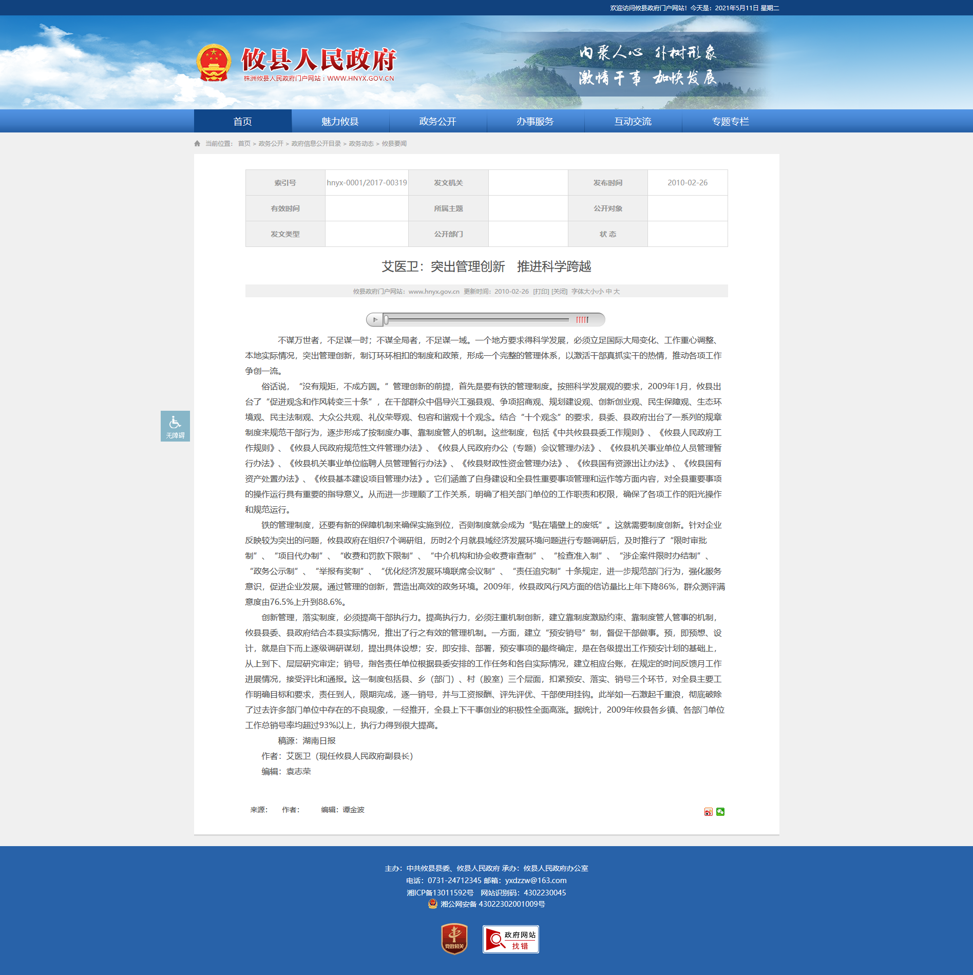 铁的管理制度,还要有新的保障机制来确保实施到位,否则制度就会成为“贴在墙壁上的废纸”。这就需要制度创新。针对企业反映较为突出的问题,攸县政府在组织7个调研组,历时2个月就县域经济发展环境问题进行专题调研后,及时推行了“限时审批制”、“项目代办制”、“收费和罚款下限制”、“中介机构和协会收费审查制”、“检查准入制”、“涉企案件限时办结制”、“政务公示制”、“举报有奖制”、“优化经济发展环境联席会议制”、“责任追究制”十条规定,进一步规范部门行为,强化服务意识,促进企业发展。通过管理的创新,营造出高效的政务环境。2009年,攸县政风行风方面的信访量比上年下降86%,群众测评满意度由76.5%上升到88.6%。