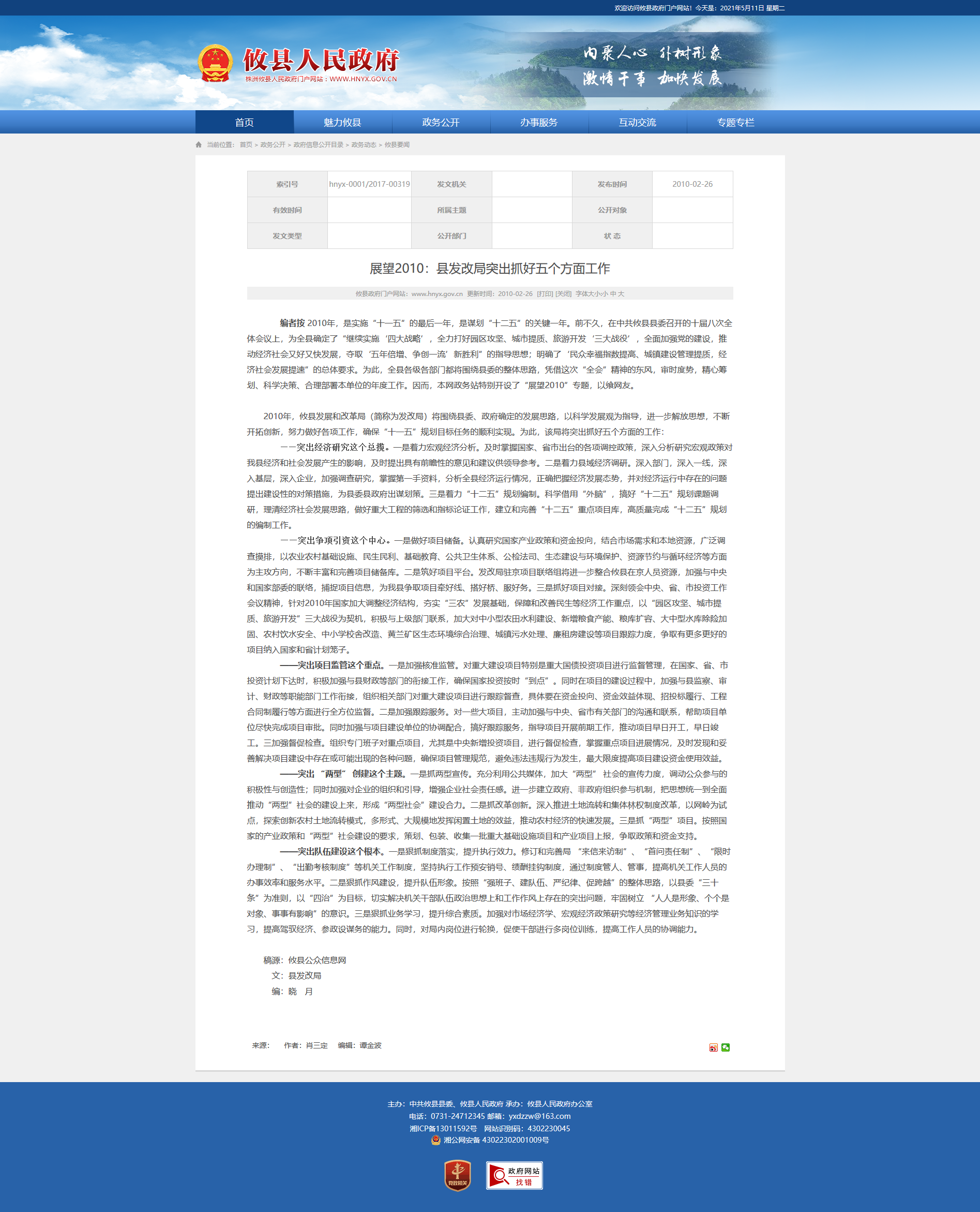编者按 2010年,是实施“十一五”的最后一年,是谋划“十二五”的关键一年。前不久,在中共攸县县委召开的十届八次全体会议上,为全县确定了“继续实施‘四大战略’,全力打好园区攻坚、城市提质、旅游开发‘三大战役’,全面加强党的建设,推动经济社会又好又快发展,夺取‘五年倍增、争创一流’新胜利”的指导思想;明确了‘民众幸福指数提高、城镇建设管理提质,经济社会发展提速”的总体要求。为此,全县各级各部门都将围绕县委的整体思路,凭借这次“全会”精神的东风,审时度势,精心筹划、科学决策、合理部署本单位的年度工作。因而,本网政务站特别开设了“展望2010”专题,以飨网友。