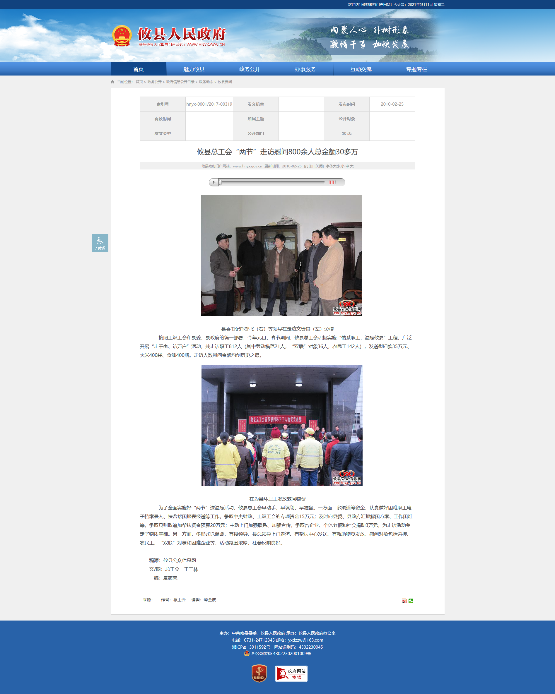 按照上级工会和县委、县政府的统一部署,今年元旦、春节期间,攸县总工会积极实施“情系职工、温暖攸县”工程,广泛开展“走千家、访万户”活动,共走访职工812人(其中劳动模范21人,“双联”对象36人,农民工142人),发送慰问款35万元、大米400袋、食油400瓶。走访人数慰问金额均创历史之最。