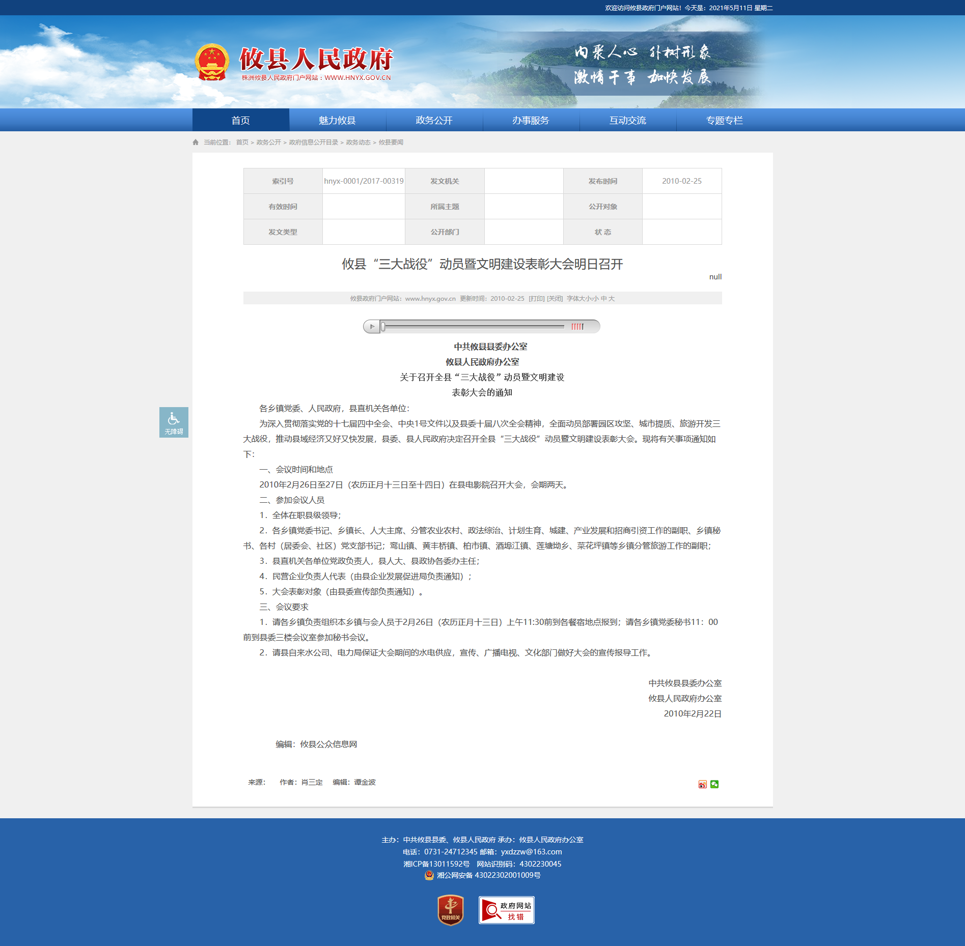 2010年2月26日至27日(农历正月十三日至十四日)在县电影院召开大会,会期两天。