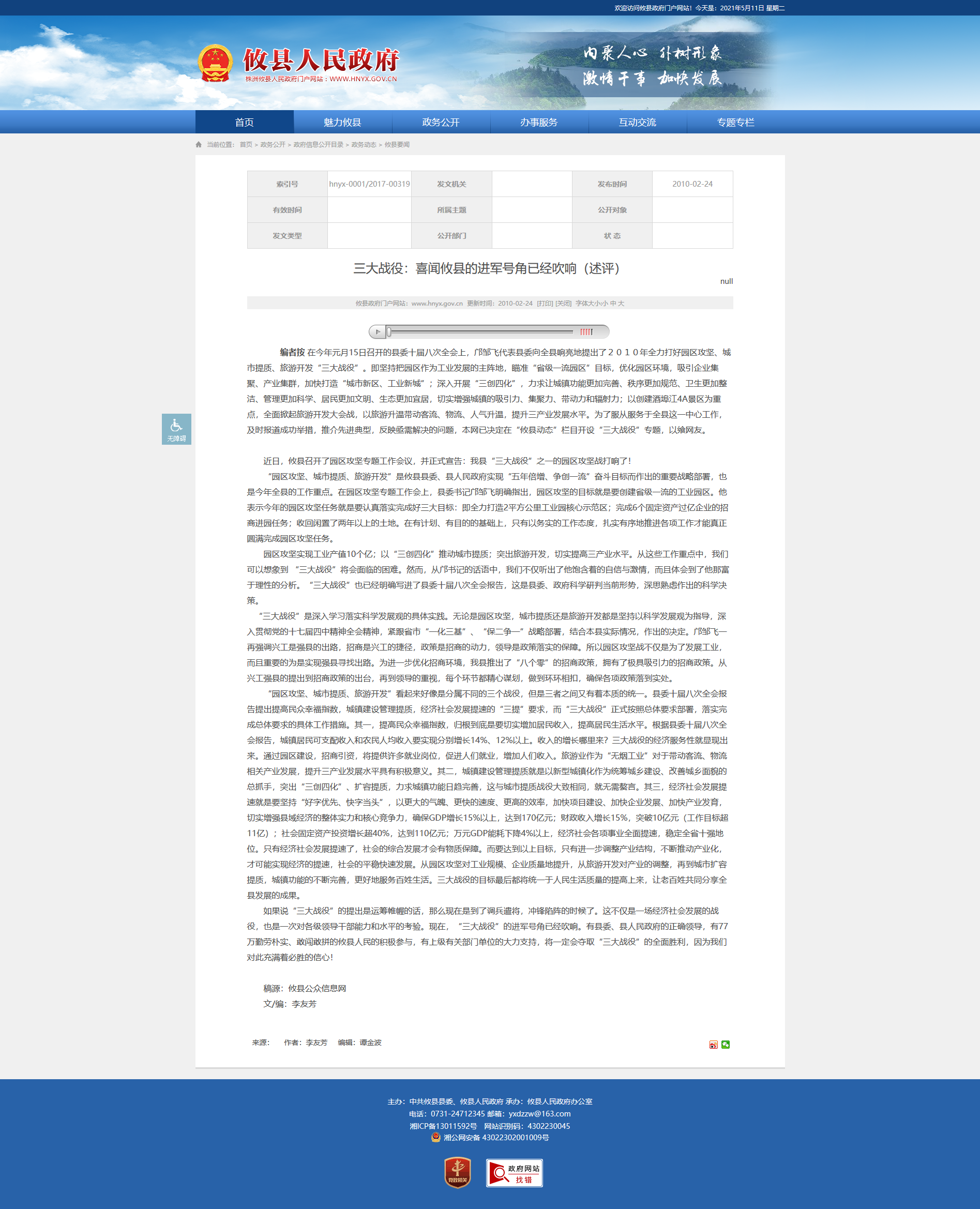 编者按 在今年元月15日召开的县委十届八次全会上,邝邹飞代表县委向全县响亮地提出了2010年全力打好园区攻坚、城市提质、旅游开发“三大战役”。即坚持把园区作为工业发展的主阵地,瞄准“省级一流园区”目标,优化园区环境,吸引企业集聚、产业集群,加快打造“城市新区、工业新城”;深入开展“三创四化”,力求让城镇功能更加完善、秩序更加规范、卫生更加整洁、管理更加科学、居民更加文明、生态更加宜居,切实增强城镇的吸引力、集聚力、带动力和辐射力;以创建酒埠江4A景区为重点,全面掀起旅游开发大会战,以旅游升温带动客流、物流、人气升温,提升三产业发展水平。为了服从服务于全县这一中心工作,及时报道成功举措,推介先进典型,反映亟需解决的问题,本网已决定在“攸县动态”栏目开设“三大战役”专题,以飨网友。