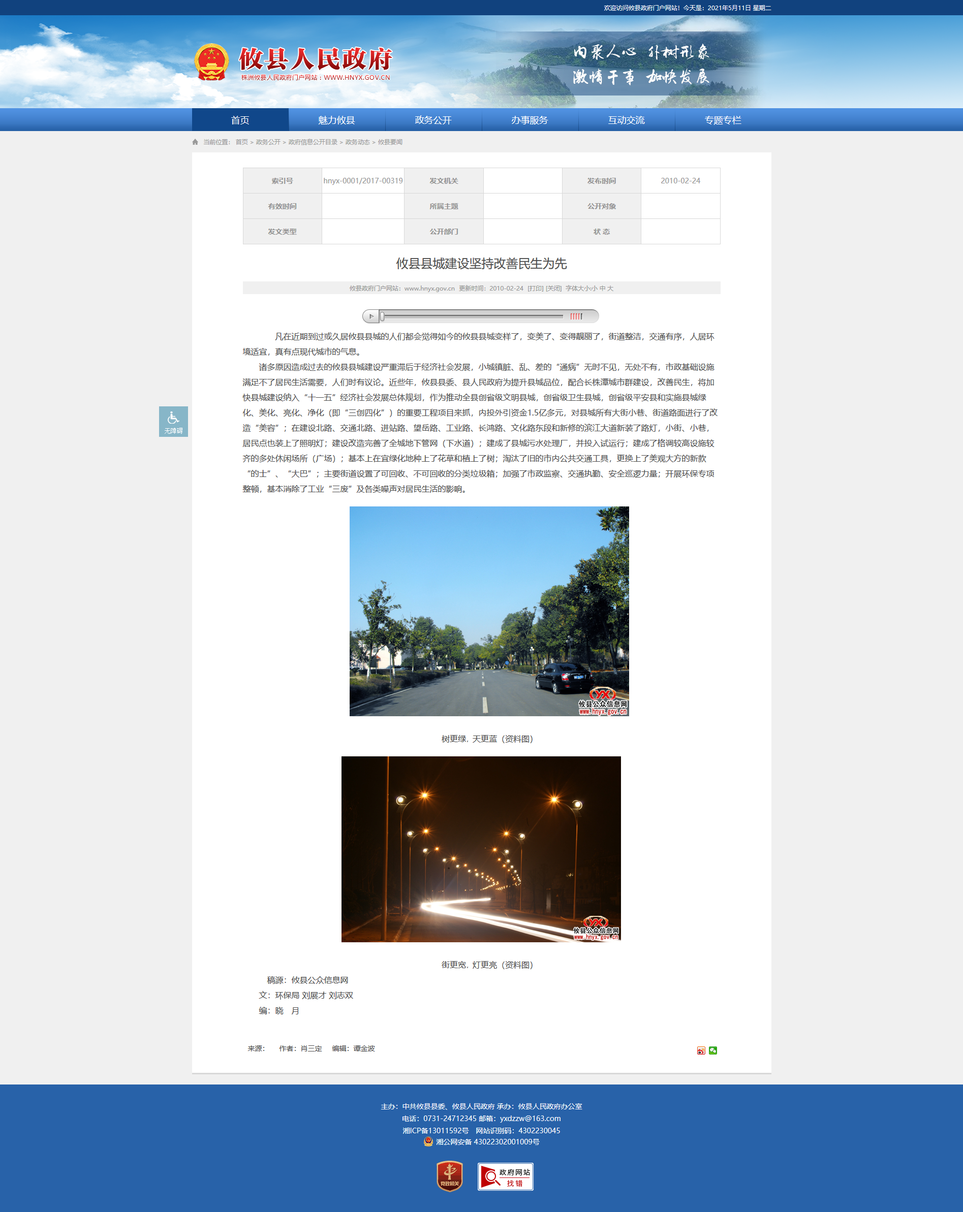 诸多原因造成过去的攸县县城建设严重滞后于经济社会发展,小城镇脏、乱、差的“通病”无时不见,无处不有,市政基础设施满足不了居民生活需要,人们时有议论。近些年,攸县县委、县人民政府为提升县城品位,配合长株潭城市群建设,改善民生,将加快县城建设纳入“十一五”经济社会发展总体规划,作为推动全县创省级文明县城,创省级卫生县城,创省级平安县和实施县城绿化、美化、亮化、净化(即“三创四化”)的重要工程项目来抓,内投外引资金1.5亿多元,对县城所有大街小巷、街道路面进行了改造“美容”;在建设北路、交通北路、进站路、望岳路、工业路、长鸿路、文化路东段和新修的滨江大道新装了路灯,小街、小巷,居民点也装上了照明灯;建设改造完善了全城地下管网(下水道);建成了县城污水处理厂,并投入试运行;建成了格调较高设施较齐的多处休闲场所(广场);基本上在宜绿化地种上了花草和植上了树;淘汰了旧的市内公共交通工具,更换上了美观大方的新款“的士”、“大巴”;主要街道设置了可回收、不可回收的分类垃圾箱;加强了市政监察、交通执勤、安全巡逻力量;开展环保专项整顿,基本消除了工业“三废”及各类噪声对居民生活的影响。