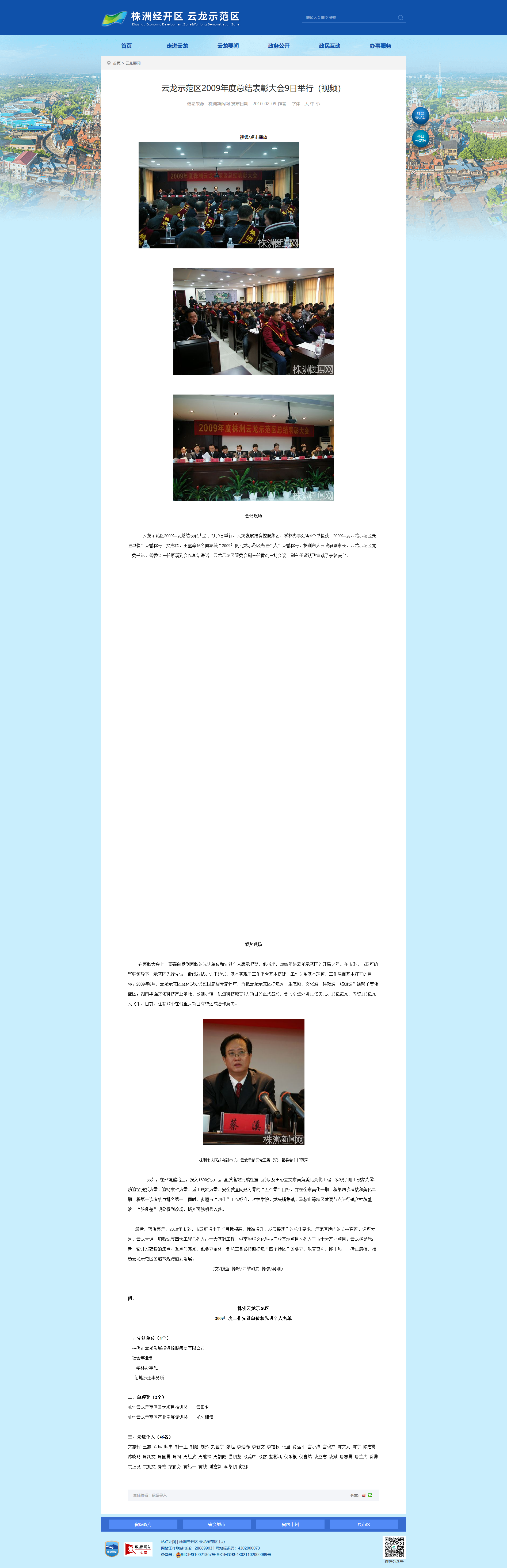 云龙示范区2009年度总结表彰大会于2月9日举行。云龙发展投资控股集团、学林办事处等4个单位获“2009年度云龙示范区先进单位”荣誉称号,文志辉、王鑫等46名同志获“2009年度云龙示范区先进个人”荣誉称号。株洲市人民政府副市长、云龙示范区党工委书记、管委会主任蔡溪到会作总结讲话,云龙示范区管委会副主任黄杰主持会议,副主任谭跃飞宣读了表彰决定。