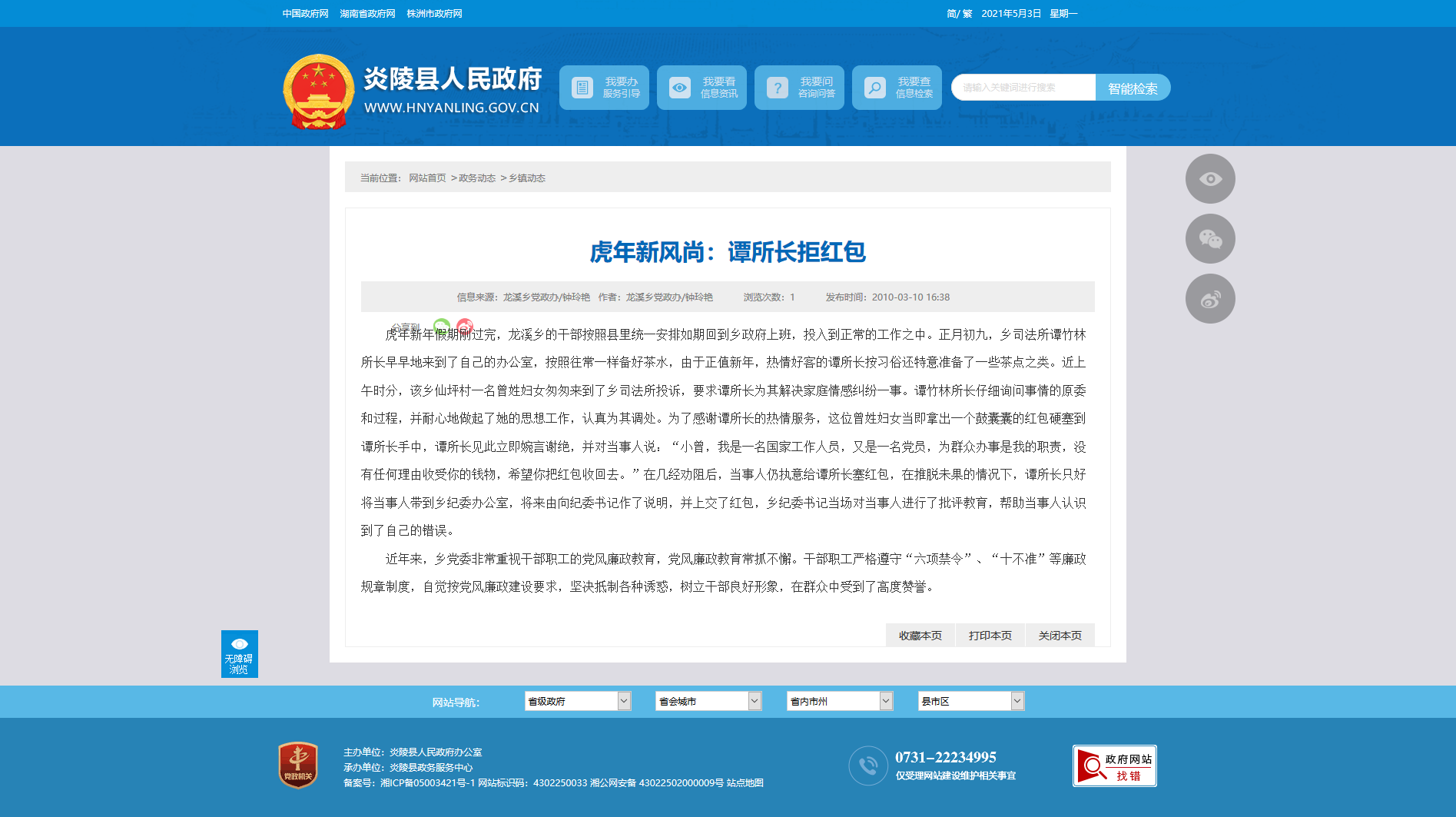 虎年新年假期刚过完,龙溪乡的干部按照县里统一安排如期回到乡政府上班,投入到正常的工作之中。正月初九,乡司法所谭竹林所长早早地来到了自己的办公室,按照往常一样备好茶水,由于正值新年,热情好客的谭所长按习俗还特意准备了一些茶点之类。近上午时分,该乡仙坪村一名曾姓妇女匆匆来到了乡司法所投诉,要求谭所长为其解决家庭情感纠纷一事。谭竹林所长仔细询问事情的原委和过程,并耐心地做起了她的思想工作,认真为其调处。为了感谢谭所长的热情服务,这位曾姓妇女当即拿出一个鼓囊囊的红包硬塞到谭所长手中,谭所长见此立即婉言谢绝,并对当事人说:“小曾,我是一名国家工作人员,又是一名党员,为群众办事是我的职责,没有任何理由收受你的钱物,希望你把红包收回去。”在几经劝阻后,当事人仍执意给谭所长塞红包,在推脱未果的情况下,谭所长只好将当事人带到乡纪委办公室,将来由向纪委书记作了说明,并上交了红包,乡纪委书记当场对当事人进行了批评教育,帮助当事人认识到了自己的错误。