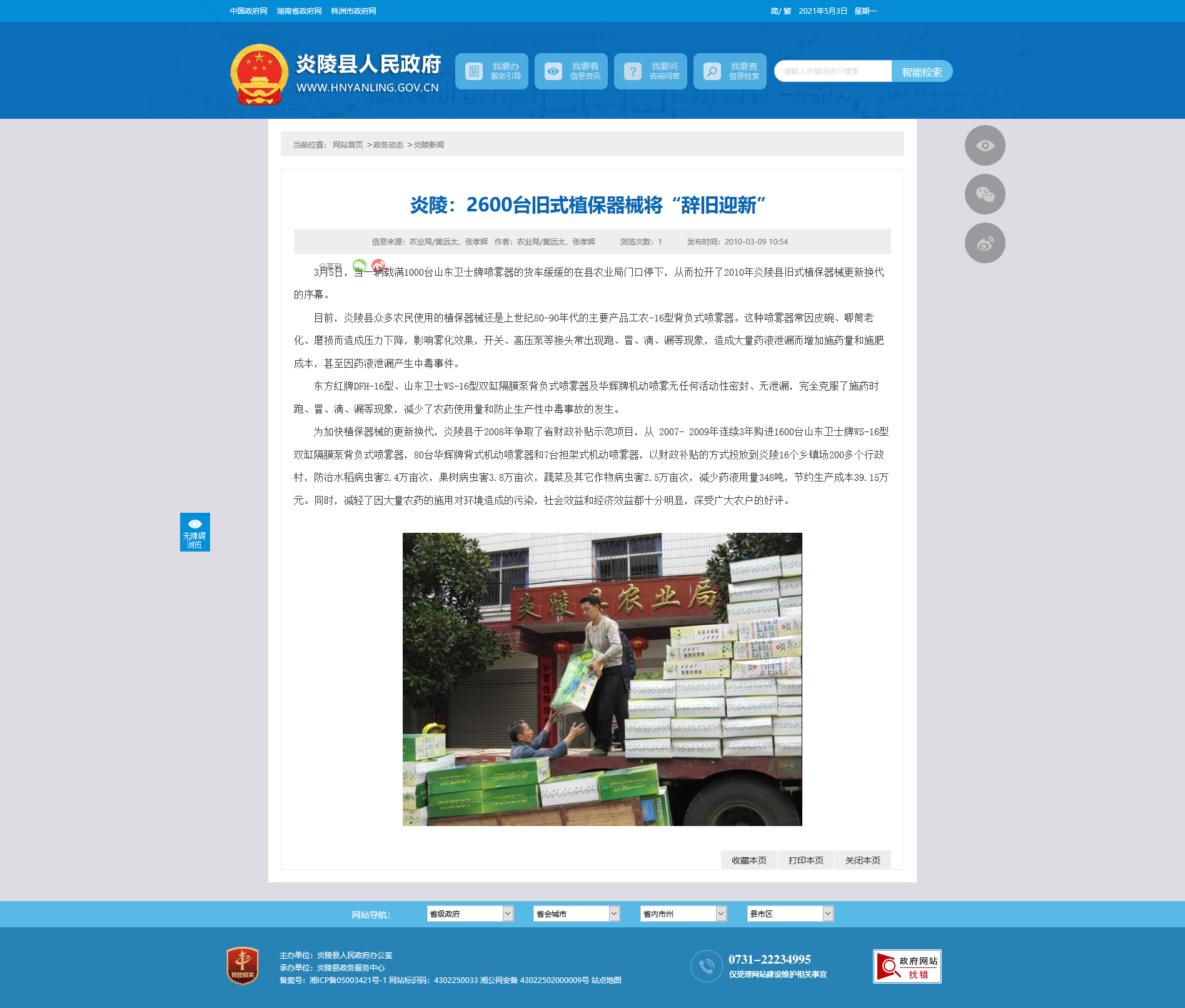 为加快植保器械的更新换代,炎陵县于2008年争取了省财政补贴示范项目,从 2007- 2009年连续3年购进1600台山东卫士牌WS-16型双缸隔膜泵背负式喷雾器,80台华辉牌背式机动喷雾器和7台担架式机动喷雾器,以财政补贴的方式投放到炎陵16个乡镇场200多个行政村,防治水稻病虫害2.4万亩次,果树病虫害3.8万亩次,蔬菜及其它作物病虫害2.5万亩次,减少药液用量348吨,节约生产成本39.15万元。同时,减轻了因大量农药的施用对环境造成的污染,社会效益和经济效益都十分明显,深受广大农户的好评。