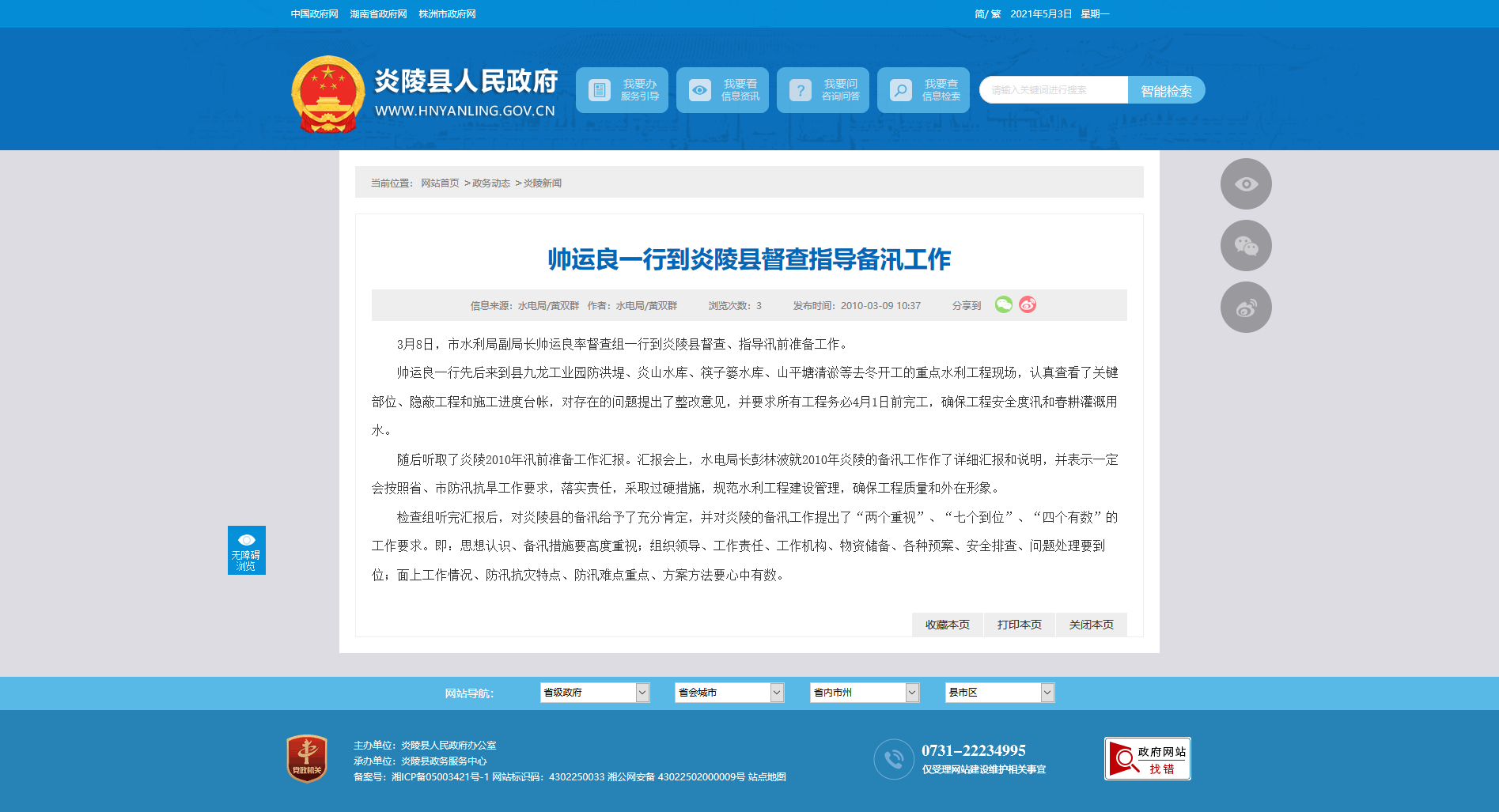 随后听取了炎陵2010年汛前准备工作汇报。汇报会上,水电局长彭林波就2010年炎陵的备汛工作作了详细汇报和说明,并表示一定会按照省、市防汛抗旱工作要求,落实责任,采取过硬措施,规范水利工程建设管理,确保工程质量和外在形象。