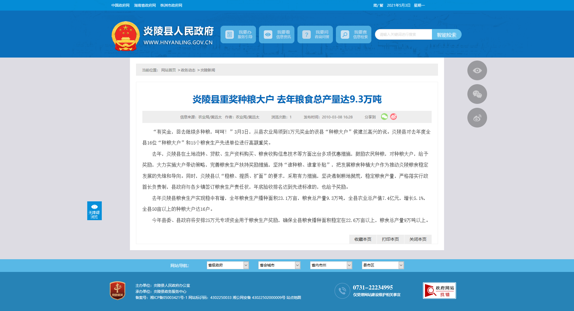 今年县委、县政府将安排25万元专项资金用于粮食生产奖励,确保全县粮食播种面积稳定在22.6万亩以上,粮食总产量9万吨以上。