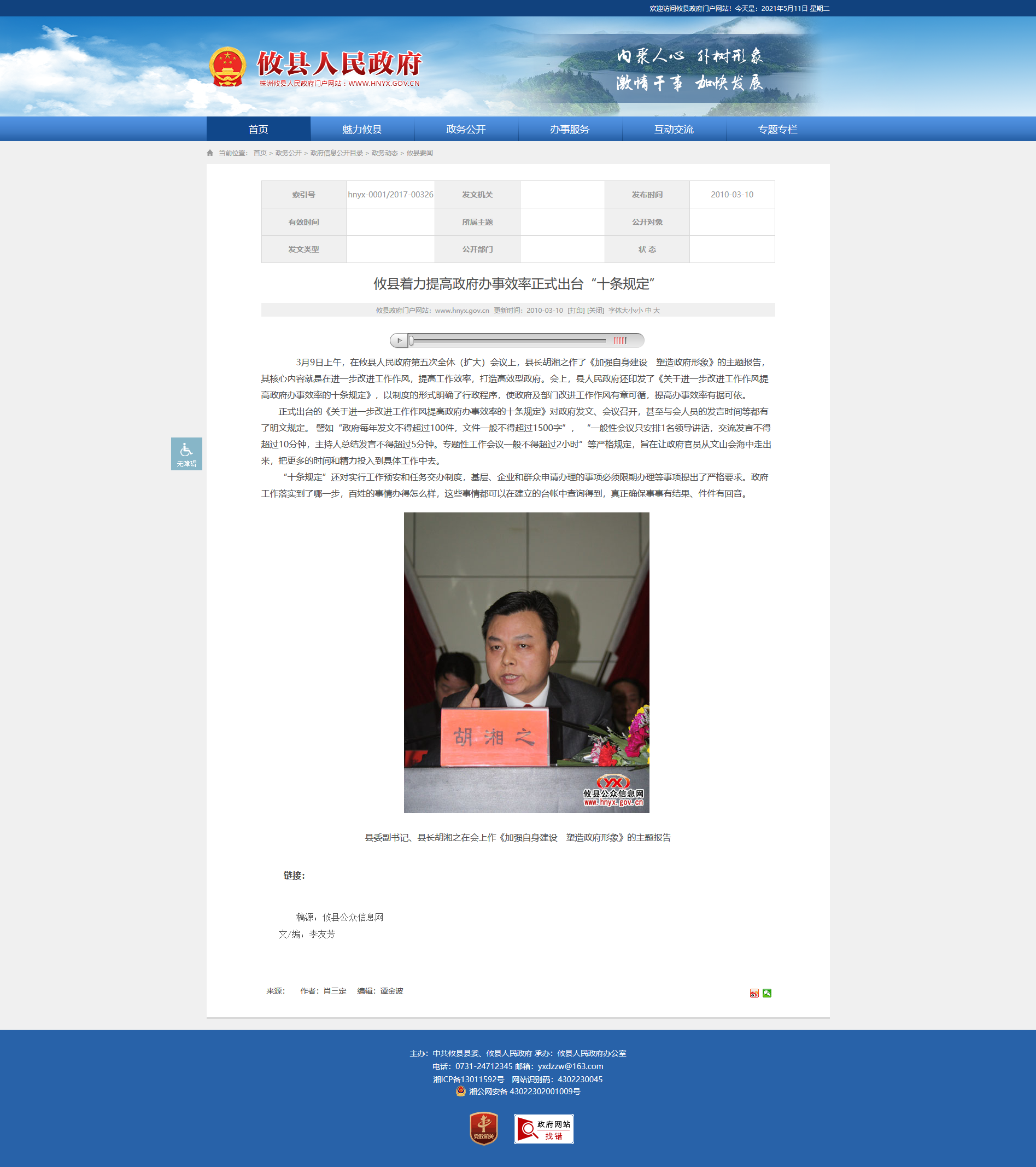 3月9日上午,在攸县人民政府第五次全体(扩大)会议上,县长胡湘之作了《加强自身建设 塑造政府形象》的主题报告,其核心内容就是在进一步改进工作作风,提高工作效率,打造高效型政府。会上,县人民政府还印发了《关于进一步改进工作作风提高政府办事效率的十条规定》,以制度的形式明确了行政程序,使政府及部门改进工作作风有章可循,提高办事效率有据可依。