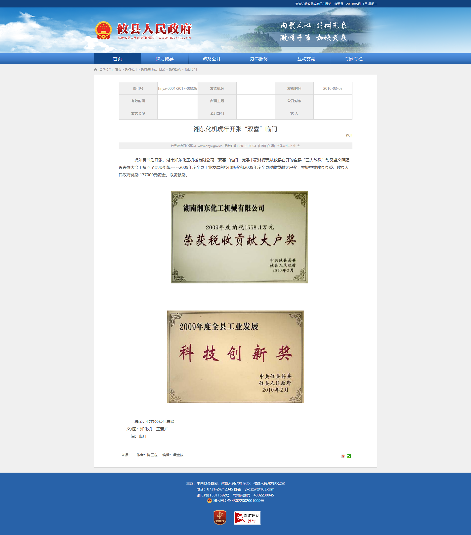 虎年春节后开张,湖南湘东化工机械有限公司“双喜“临门,党委书记林德晃从攸县召开的全县“三大战役”动员暨文明建设表彰大会上捧回了两项奖牌-----2009年度全县工业发展科技创新奖和2009年度全县税收贡献大户奖,并被中共攸县县委、攸县人民政府奖励 177000元资金,以资鼓励。