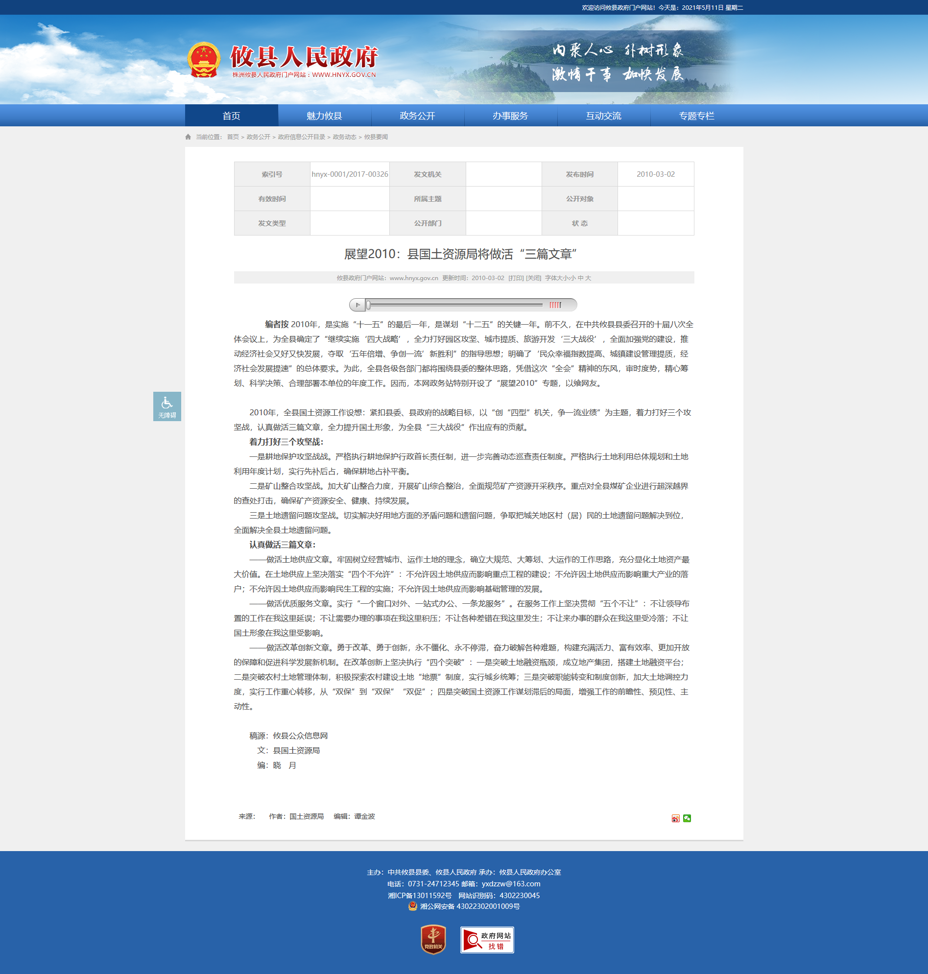 编者按 2010年,是实施“十一五”的最后一年,是谋划“十二五”的关键一年。前不久,在中共攸县县委召开的十届八次全体会议上,为全县确定了“继续实施‘四大战略’,全力打好园区攻坚、城市提质、旅游开发‘三大战役’,全面加强党的建设,推动经济社会又好又快发展,夺取‘五年倍增、争创一流’新胜利”的指导思想;明确了‘民众幸福指数提高、城镇建设管理提质,经济社会发展提速”的总体要求。为此,全县各级各部门都将围绕县委的整体思路,凭借这次“全会”精神的东风,审时度势,精心筹划、科学决策、合理部署本单位的年度工作。因而,本网政务站特别开设了“展望2010”专题,以飨网友。