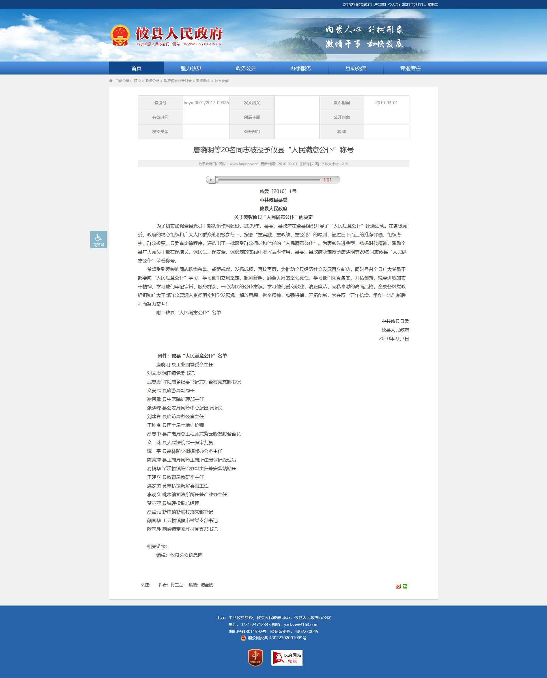 为了切实加强全县党员干部队伍作风建设,2009年,县委、县政府在全县组织开展了“人民满意公仆”评选活动。在各级党委、政府的精心组织和广大人民群众的积极参与下,按照“重实践、重政绩、重公论”的原则,通过自下而上的推荐评选、组织考察、群众投票、县委审定等程序,评选出了一批深受群众拥护和信任的“人民满意公仆”。为表彰先进典型,弘扬时代精神,激励全县广大党员干部在保增长、保民生、保安全、保稳定的实践中发挥表率作用,县委、县政府决定授予唐晓明等20名同志攸县“人民满意公仆”荣誉称号。