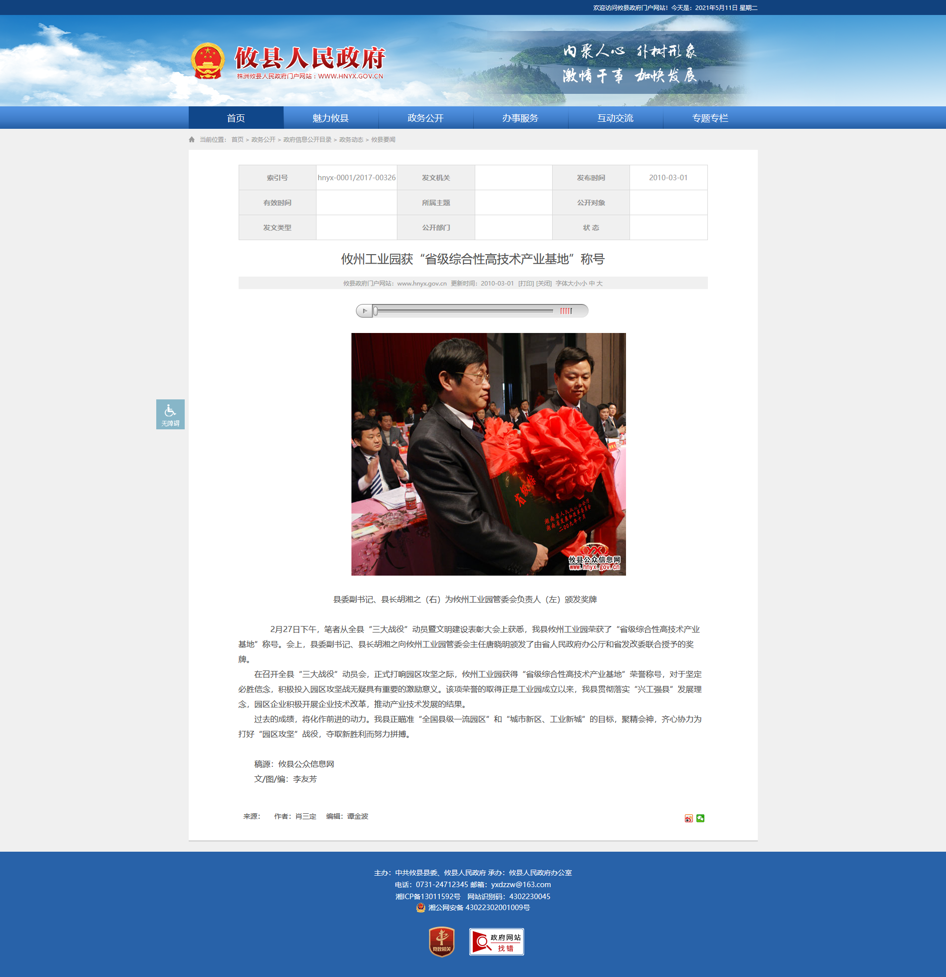 2月27日下午,笔者从全县“三大战役”动员暨文明建设表彰大会上获悉,我县攸州工业园荣获了“省级综合性高技术产业基地”称号。会上,县委副书记、县长胡湘之向攸州工业园管委会主任唐晓明颁发了由省人民政府办公厅和省发改委联合授予的奖牌。