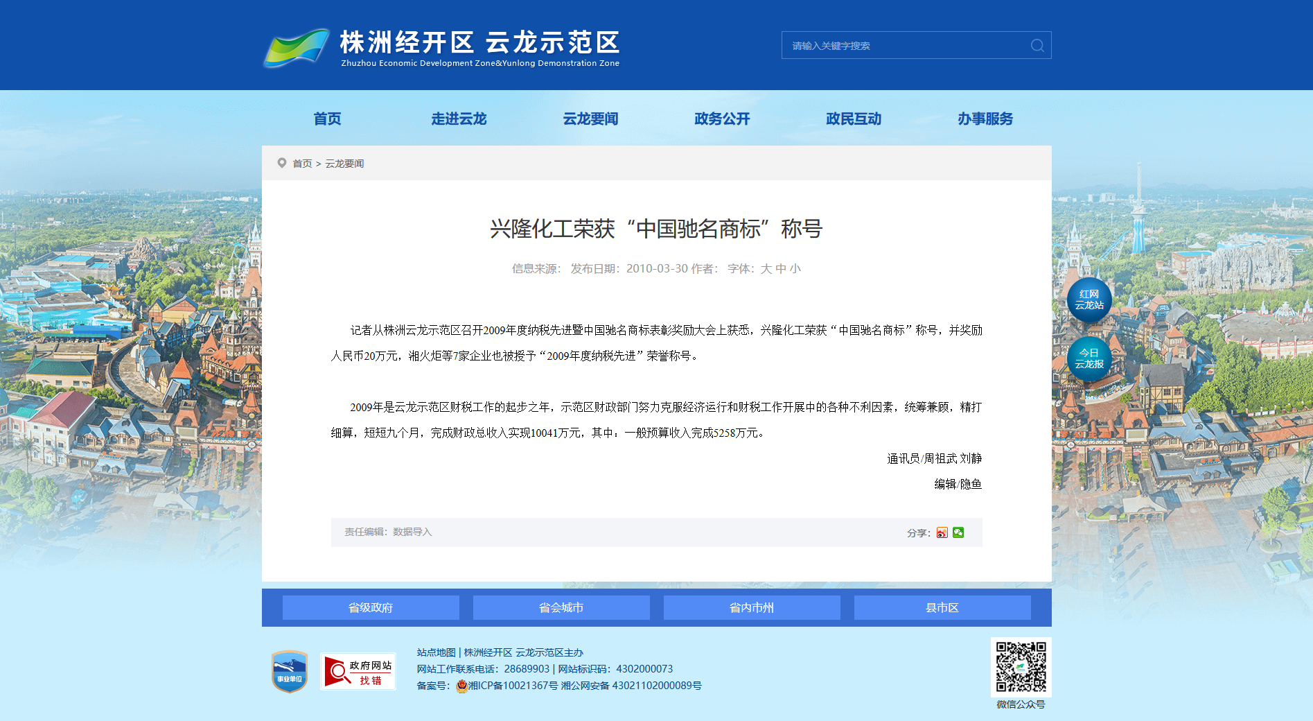 记者从株洲云龙示范区召开2009年度纳税先进暨中国驰名商标表彰奖励大会上获悉,兴隆化工荣获“中国驰名商标”称号,并奖励人民币20万元,湘火炬等7家企业也被授予“2009年度纳税先进”荣誉称号。