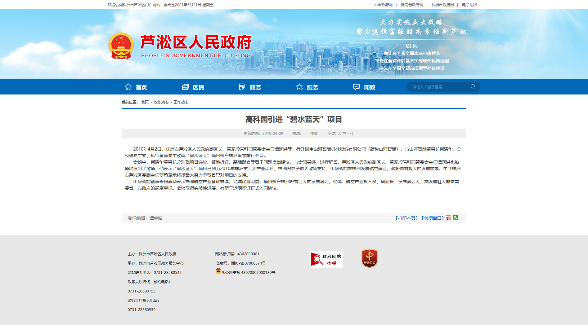 2010年4月2日,株洲市芦淞区人民政府副区长、董家塅高科园管委会主任谭润洪等一行赴湖南山河智能机械股份有限公司(简称山河智能),与山河智能董事长何清华、总经理易宇安、执行董事易宇欣就“碧水蓝天”项目落户株洲事宜举行会谈。会谈中,何清华董事长分别就项目选址、征地拆迁、基础配套等若干问题提出建议,与会领导逐一进行解答。芦淞区人民政府副区长、董家塅高科园管委会主任谭润洪也热情地发出了邀请,他表示“碧水蓝天”项目已列为2010年株洲市十大产业项目,株洲将给予最大政策支持,山河智能来株洲发展航空事业,必将具有极大的发展前景。中共株洲市芦淞区委副主任罗勇表示将尽最大努力争取省里对项目的支持。山河智能董事长何清华表示株洲航空产业基础雄厚,地域优势明显,项目落户株洲将有巨大的发展潜力,他说:航空产业投入多、周期长、发展潜力大,其发展壮大非常需要省、市政府的高度重视。会谈取得突破性进展,有望于近期签订正式入园协议。