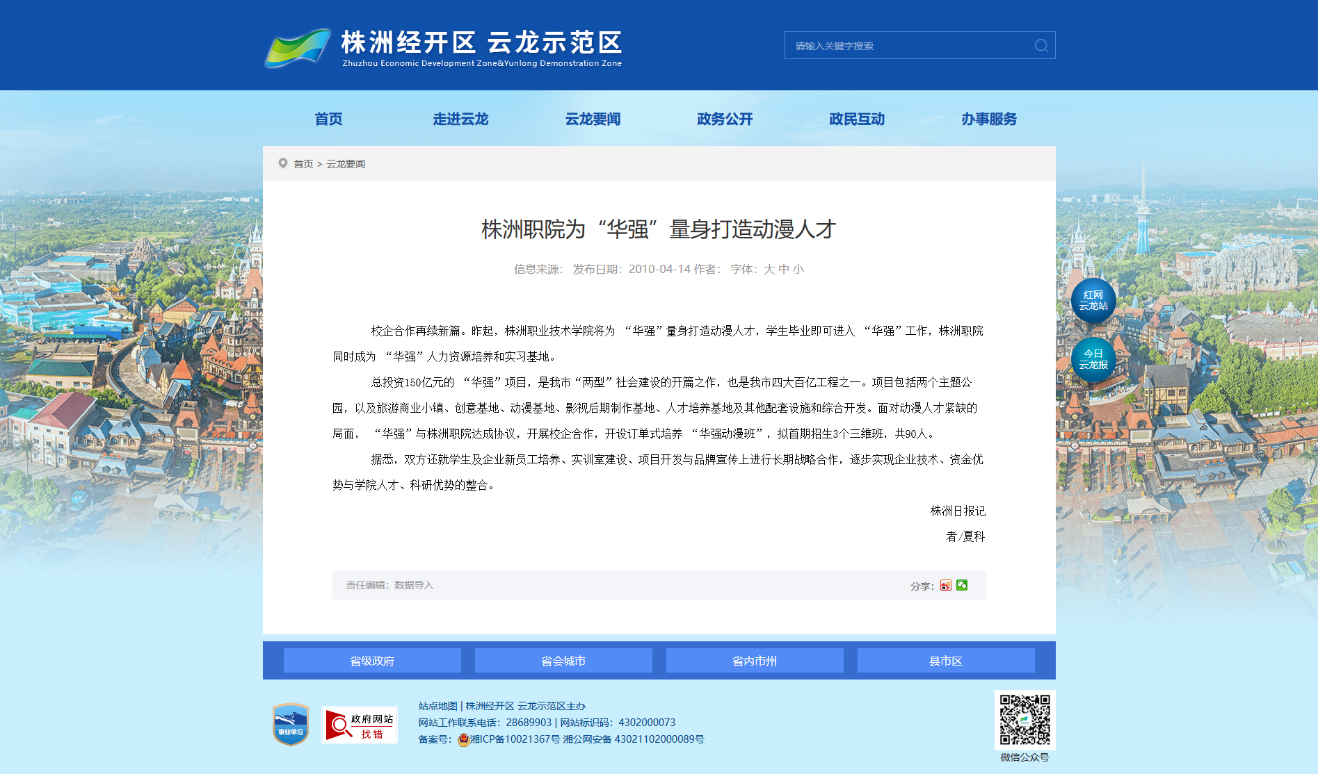 总投资150亿元的 “华强”项目,是我市“两型”社会建设的开篇之作,也是我市四大百亿工程之一。项目包括两个主题公园,以及旅游商业小镇、创意基地、动漫基地、影视后期制作基地、人才培养基地及其他配套设施和综合开发。面对动漫人才紧缺的局面, “华强”与株洲职院达成协议,开展校企合作,开设订单式培养 “华强动漫班”,拟首期招生3个三维班,共90人。