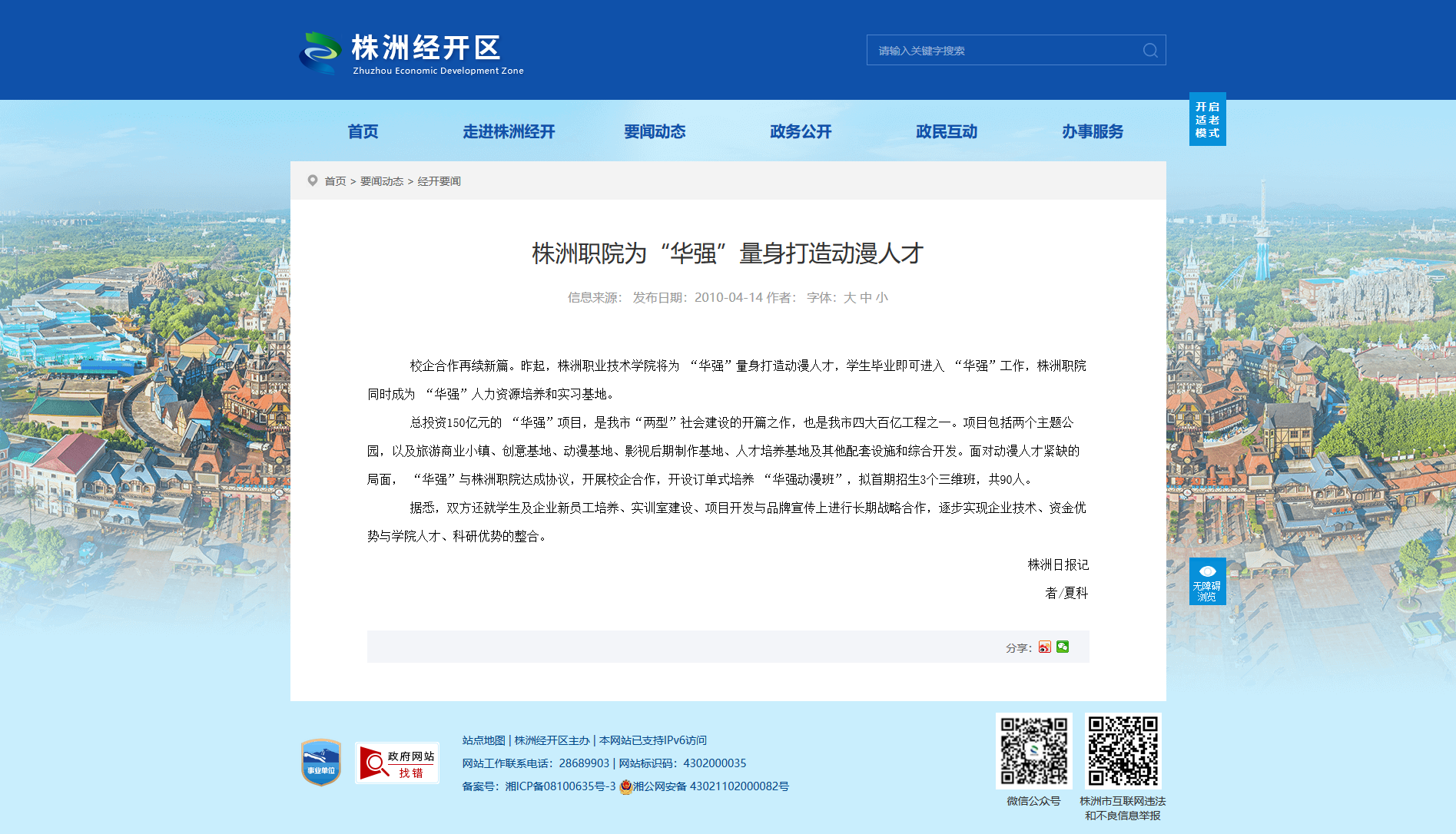 总投资150亿元的 “华强”项目,是我市“两型”社会建设的开篇之作,也是我市四大百亿工程之一。项目包括两个主题公园,以及旅游商业小镇、创意基地、动漫基地、影视后期制作基地、人才培养基地及其他配套设施和综合开发。面对动漫人才紧缺的局面, “华强”与株洲职院达成协议,开展校企合作,开设订单式培养 “华强动漫班”,拟首期招生3个三维班,共90人。