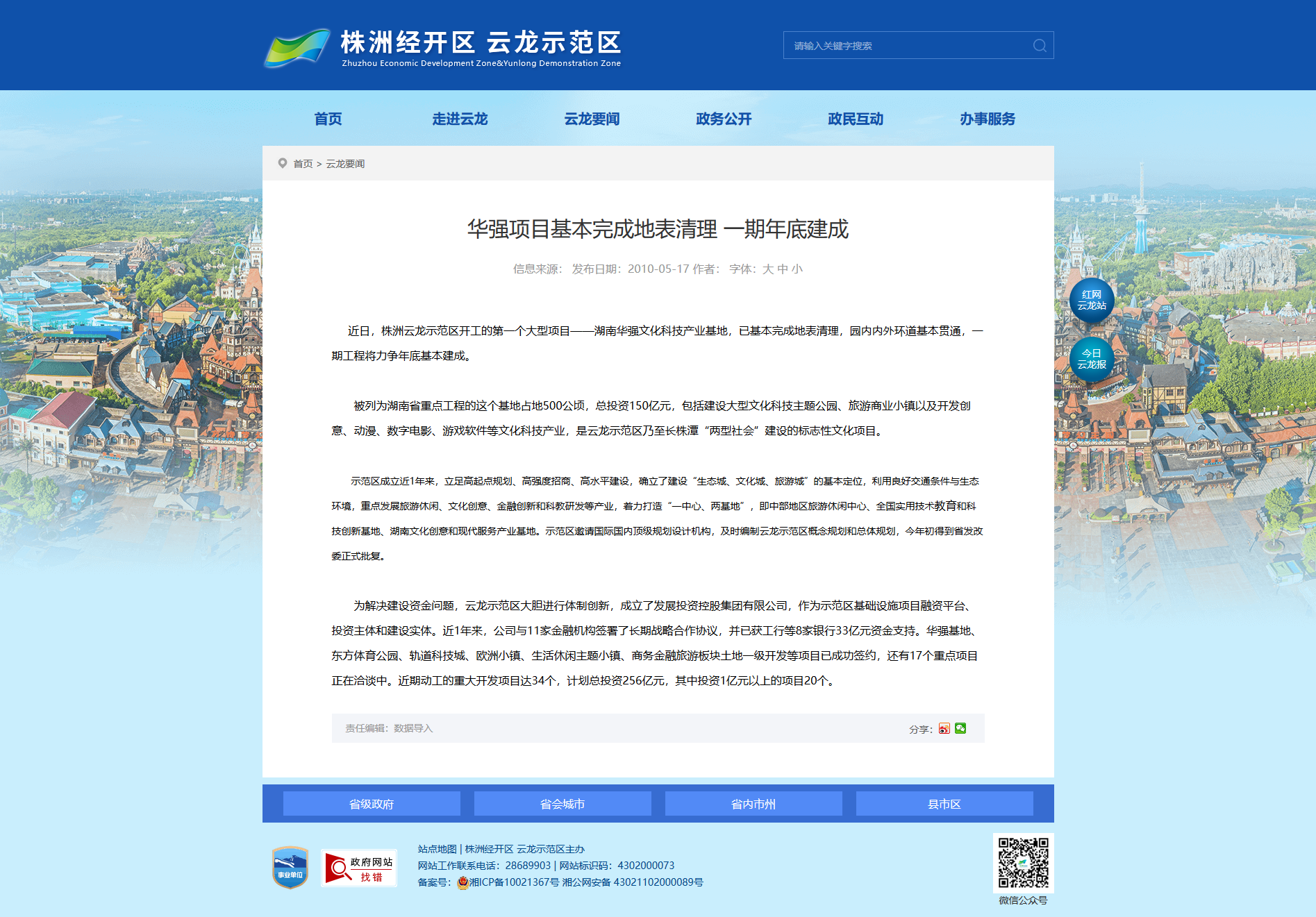 近日,株洲云龙示范区开工的第一个大型项目——湖南华强文化科技产业基地,已基本完成地表清理,园内内外环道基本贯通,一期工程将力争年底基本建成。