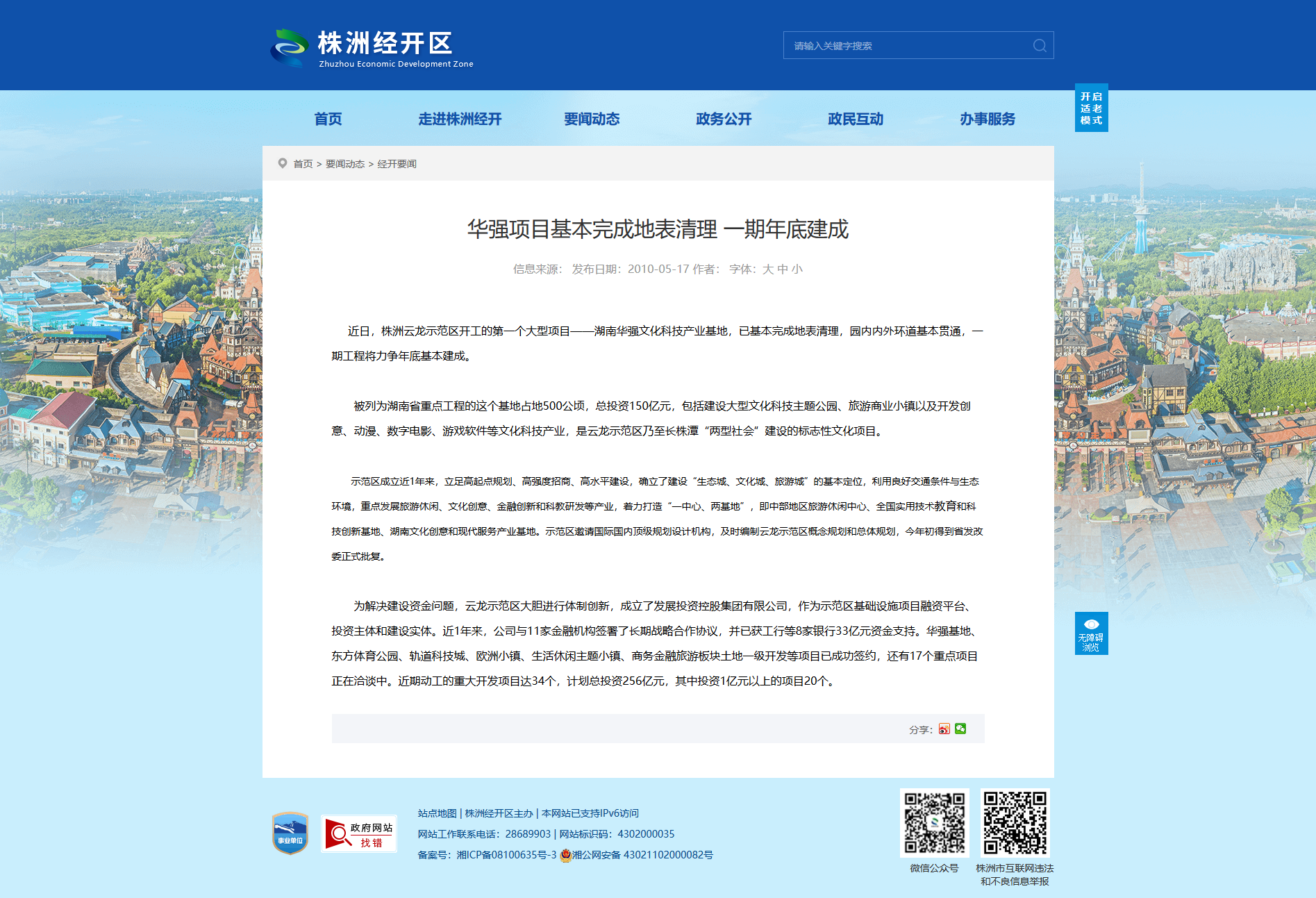 近日,株洲云龙示范区开工的第一个大型项目——湖南华强文化科技产业基地,已基本完成地表清理,园内内外环道基本贯通,一期工程将力争年底基本建成。