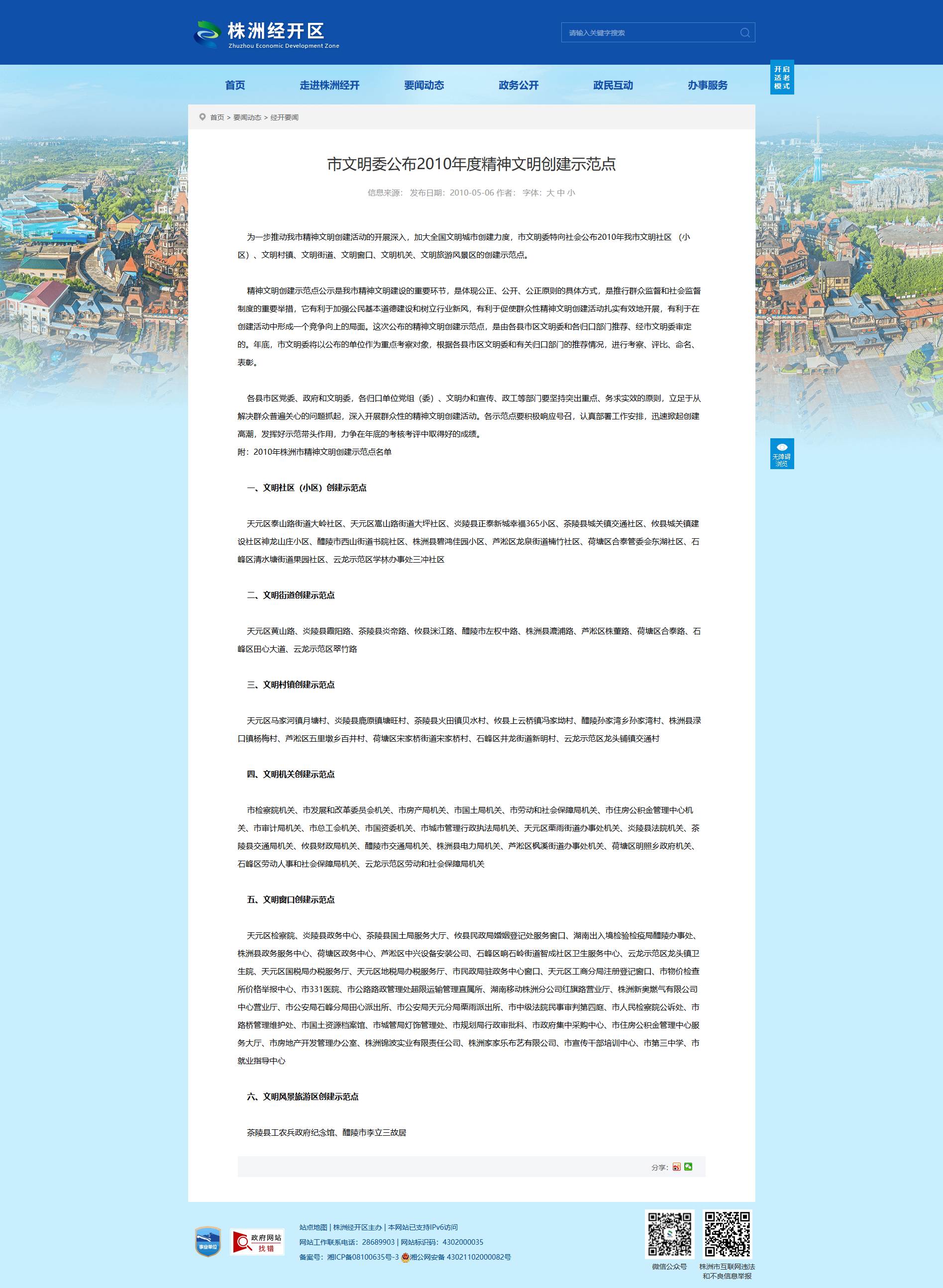 为一步推动我市精神文明创建活动的开展深入,加大全国文明城市创建力度,市文明委特向社会公布2010年我市文明社区 (小区)、文明村镇、文明街道、文明窗口、文明机关、文明旅游风景区的创建示范点。