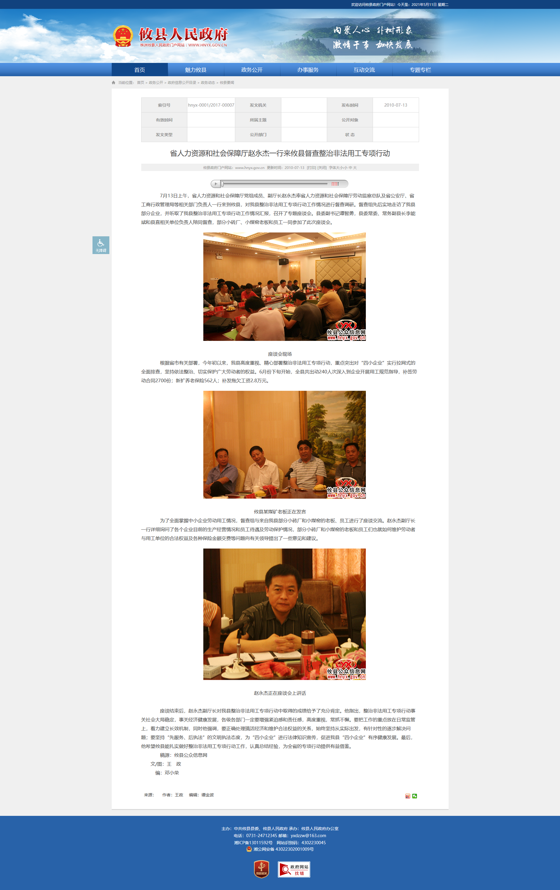 7月13日上午,省人力资源和社会保障厅党组成员、副厅长赵永杰率省人力资源和社会保障厅劳动监察总队及省公安厅、省工商行政管理局等相关部门负责人一行来到攸县,对我县整治非法用工专项行动工作情况进行督查调研。督查组先后实地走访了我县部分企业,并听取了我县整治非法用工专项行动工作情况汇报,召开了专题座谈会。县委副书记谭智勇,县委常委、常务副县长李能斌和县直相关单位负责人陪同督查,部分小砖厂、小煤窑老板和员工一同参加了此次座谈会。