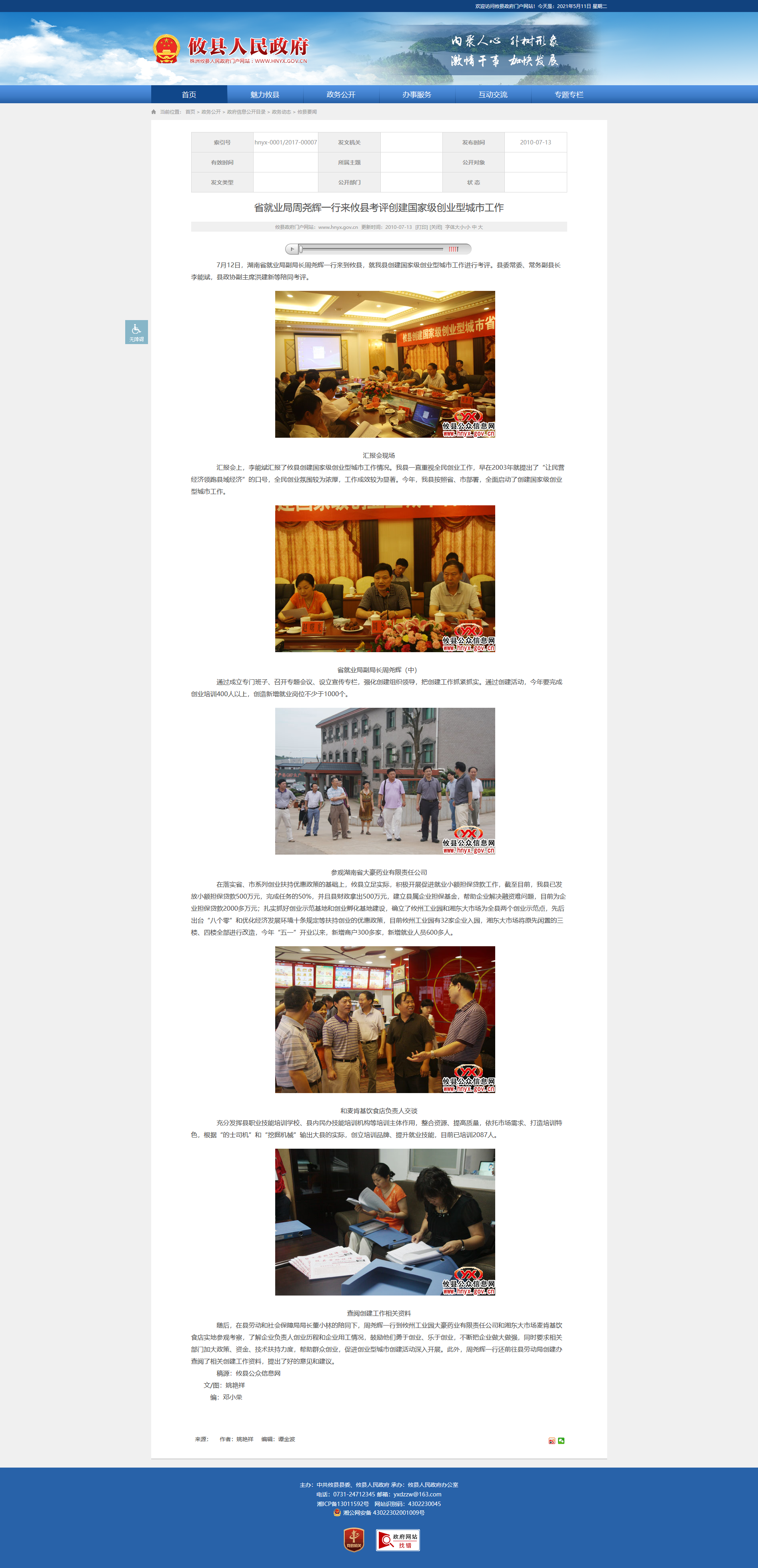 7月12日,湖南省就业局副局长周尧辉一行来到攸县,就我县创建国家级创业型城市工作进行考评。县委常委、常务副县长李能斌,县政协副主席洪建新等陪同考评。