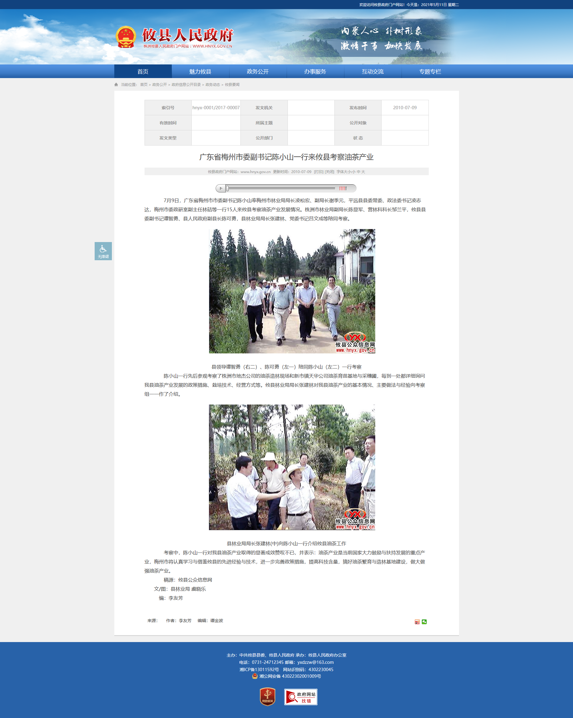 7月9日,广东省梅州市市委副书记陈小山率梅州市林业局局长凌松宏、副局长谢季元,平远县县委常委、政法委书记凌志达,梅州市委政研室副主任林硈等一行15人来攸县考察油茶产业发展情况。株洲市林业局副局长陈显军、营林科科长邹兰平,攸县县委副书记谭智勇、县人民政府副县长陈可勇,县林业局局长张建林、党委书记吕文成等陪同考察。