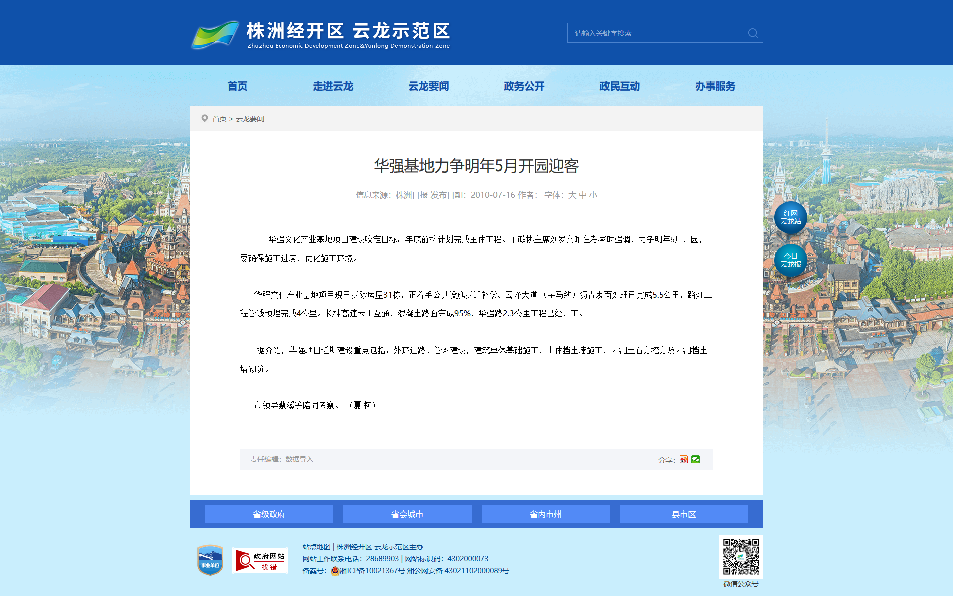 华强文化产业基地项目现已拆除房屋31栋,正着手公共设施拆迁补偿。云峰大道 (茶马线)沥青表面处理已完成5.5公里,路灯工程管线预埋完成4公里。长株高速云田互通,混凝土路面完成95%,华强路2.3公里工程已经开工。