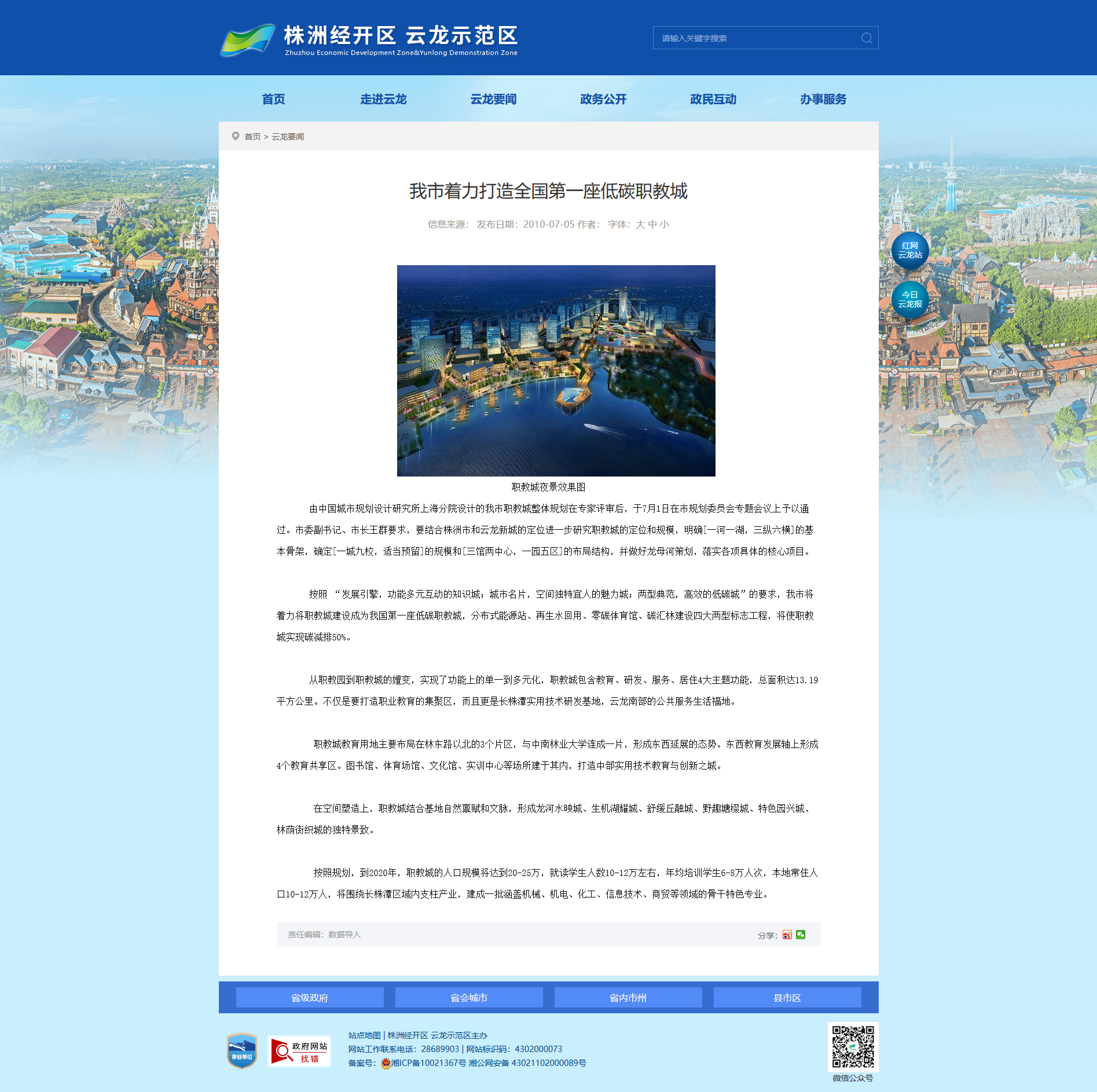 由中国城市规划设计研究所上海分院设计的我市职教城整体规划在专家评审后,于7月1日在市规划委员会专题会议上予以通过。市委副书记、市长王群要求,要结合株洲市和云龙新城的定位进一步研究职教城的定位和规模,明确[一河一湖,三纵六横]的基本骨架,确定[一城九校,适当预留]的规模和[三馆两中心,一园五区]的布局结构,并做好龙母河策划,落实各项具体的核心项目。